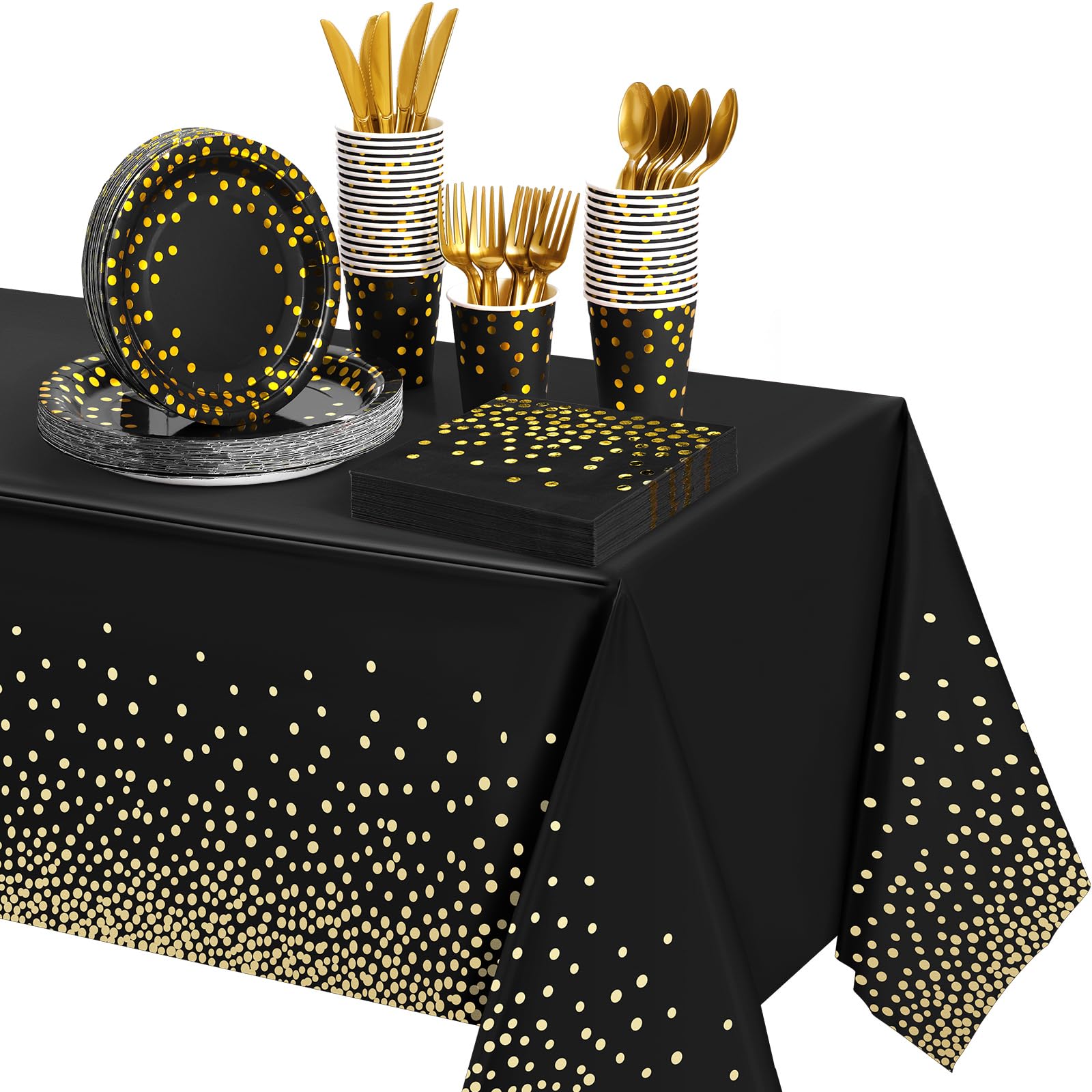 Tegeme 256 piezas de suministros de fiesta de puntos negros y dorados, platos de papel, servilletas, vasos, manteles desechables,