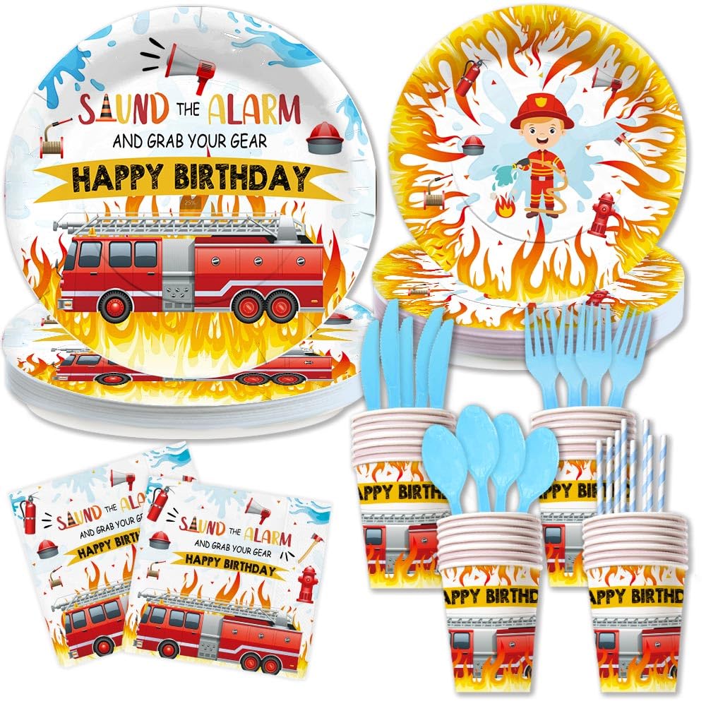 Lofaris Juego de vajilla de cumpleaños de 192 piezas, suministros de fiesta temática de bomberos, platos de papel de 7 y 9 pulgada