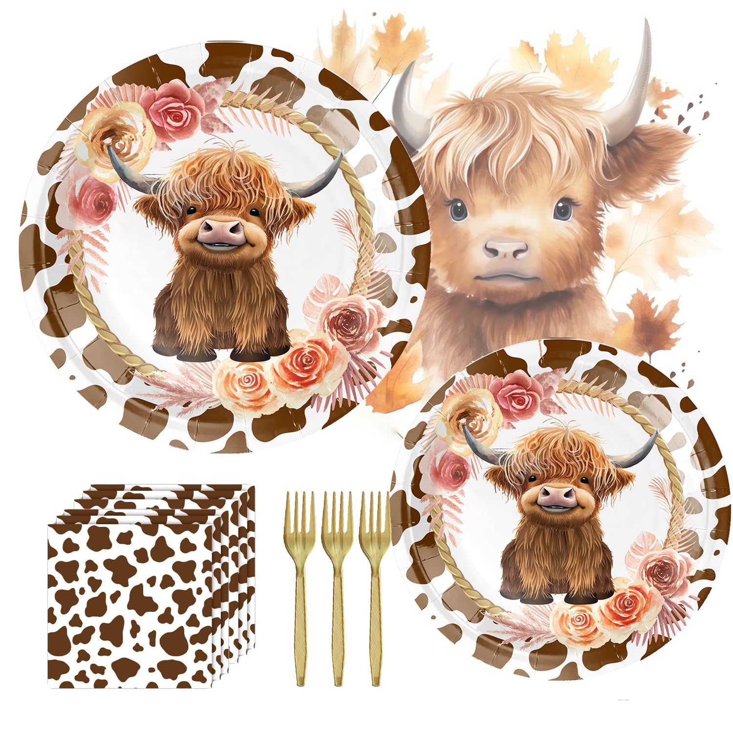Suministros de fiesta de vaca de las montañas – 80 piezas de vajilla de vaca de las tierras altas con platos de papel, servilletas