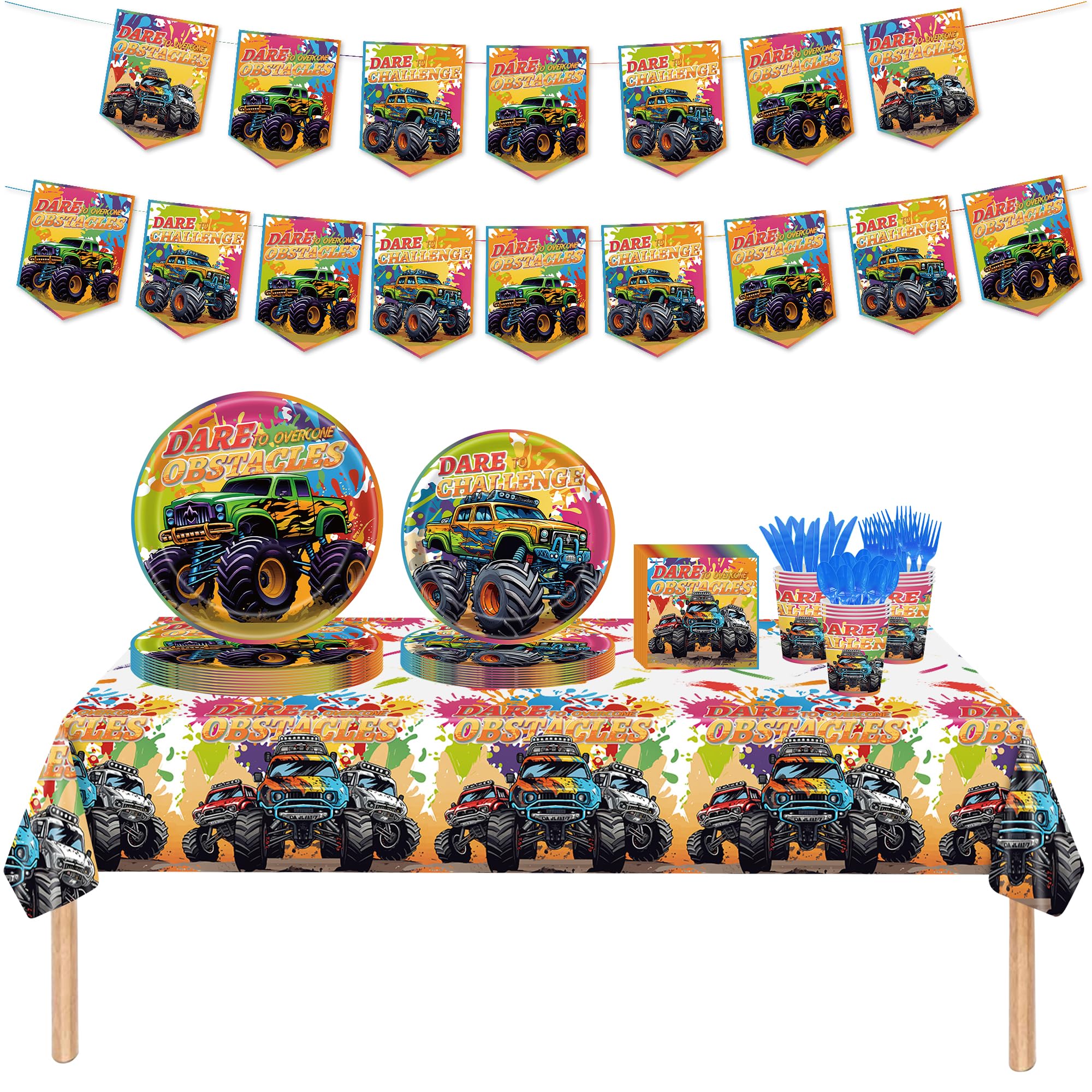 Juego de 170 piezas de decoración de cumpleaños de Monster Truck para decoración de cumpleaños, incluye pancarta, platos, platos,