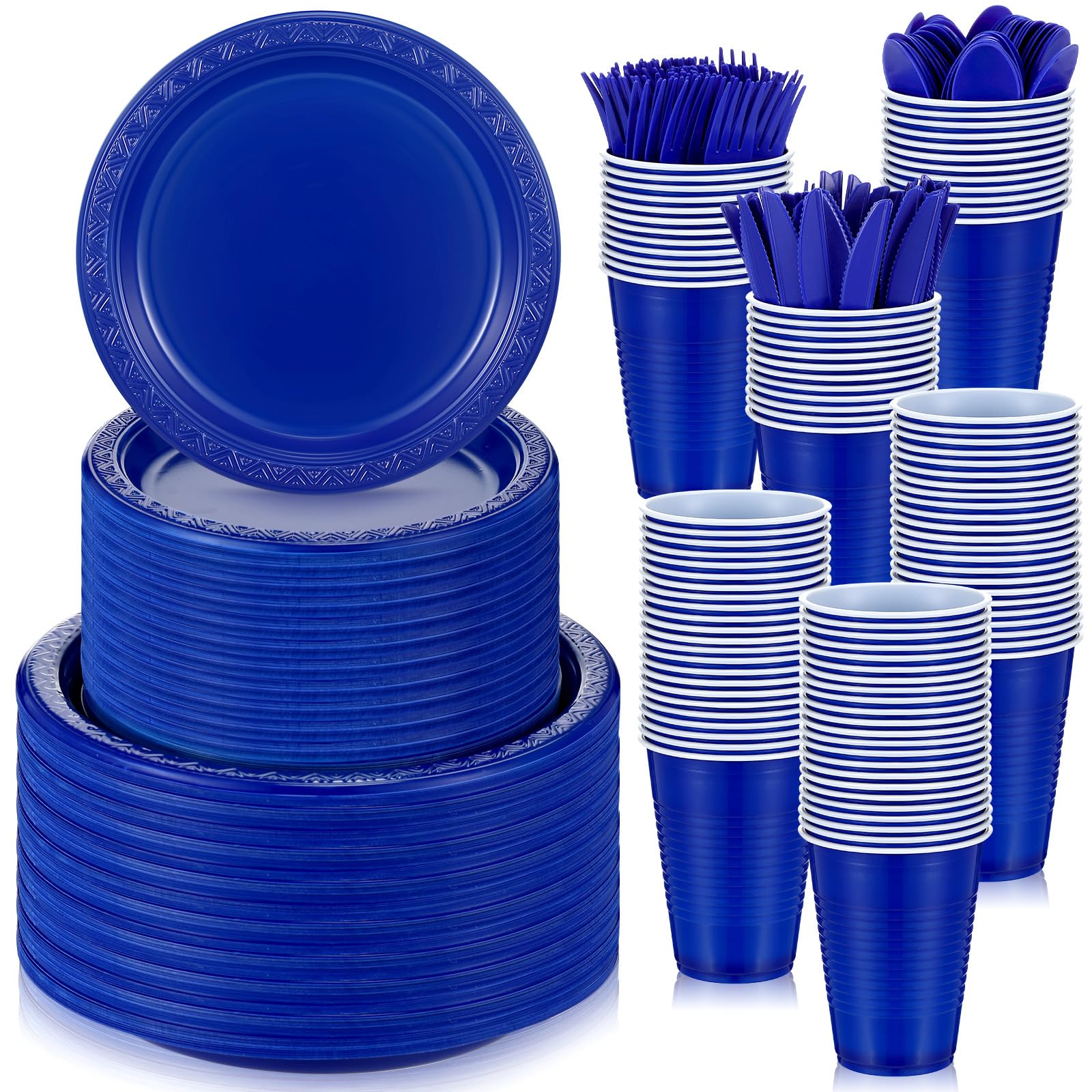 Uiifan El juego de vajilla de plástico azul de 300 piezas incluye 50 platos llanos, 50 platos de aperitivo, 50 tazas, 50 cuchillos