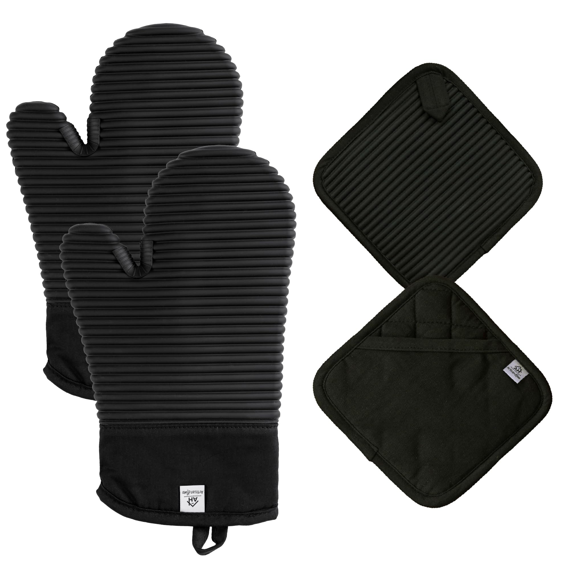 Juego de guantes de horno y soportes de olla de silicona negros | Almohadillas calientes de silicona resistentes al calor y guante