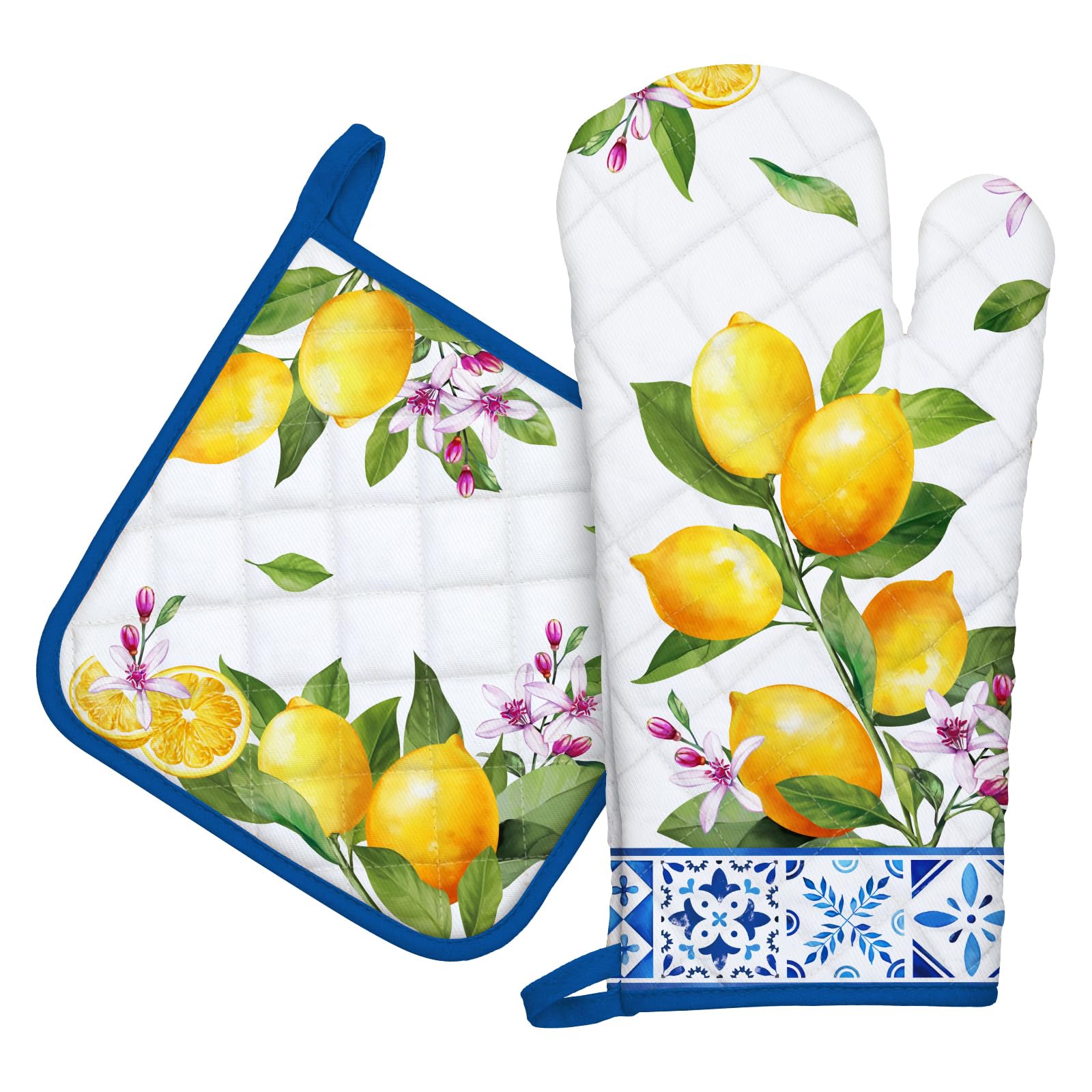 Juego de 2 manoplas de horno de limón de verano y soportes para ollas, 100% algodón, resistentes al calor, guantes de horno extral