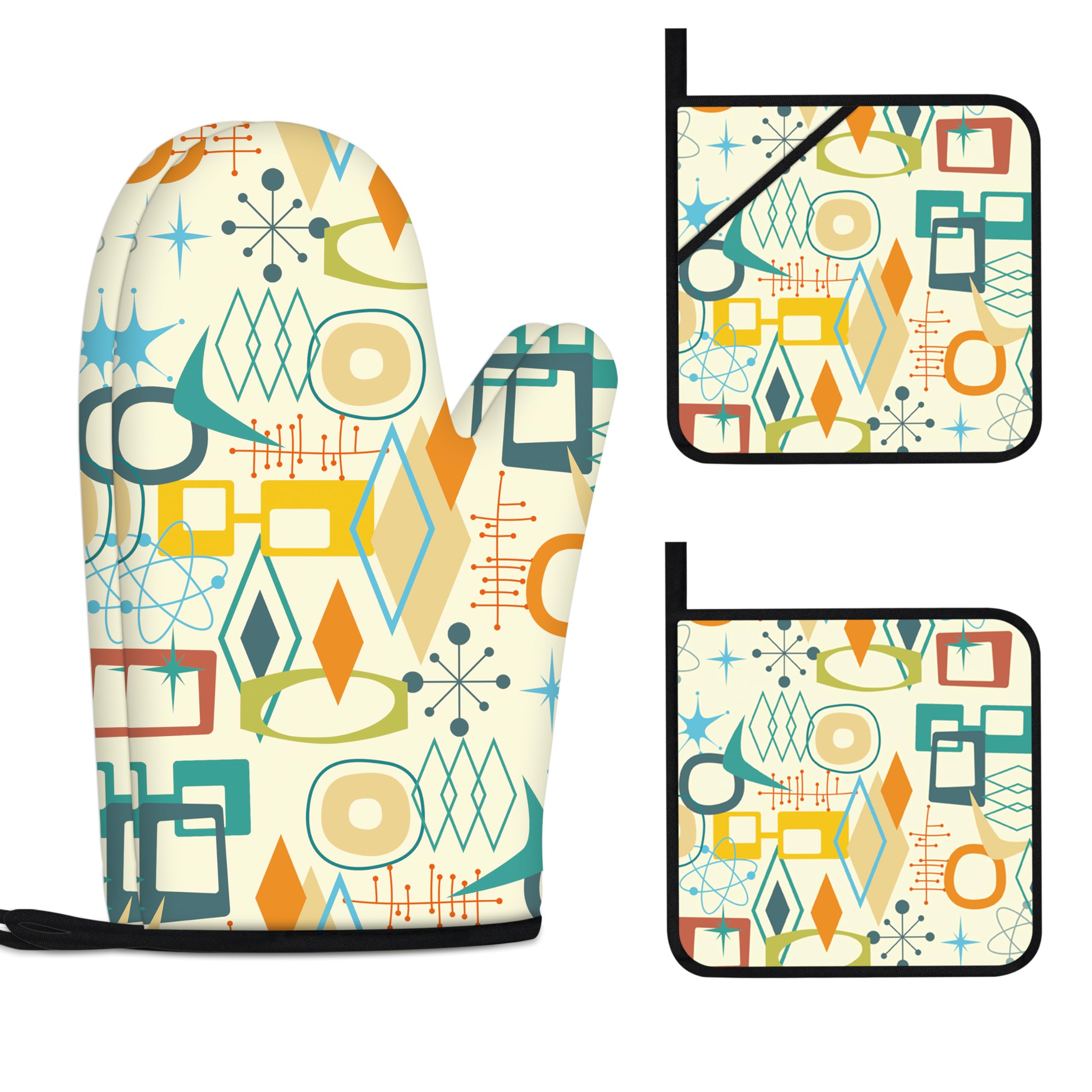 Juego de guantes de horno y soportes para ollas modernos de mediados de siglo, guantes de horno lavables, resistentes al calor, 4
