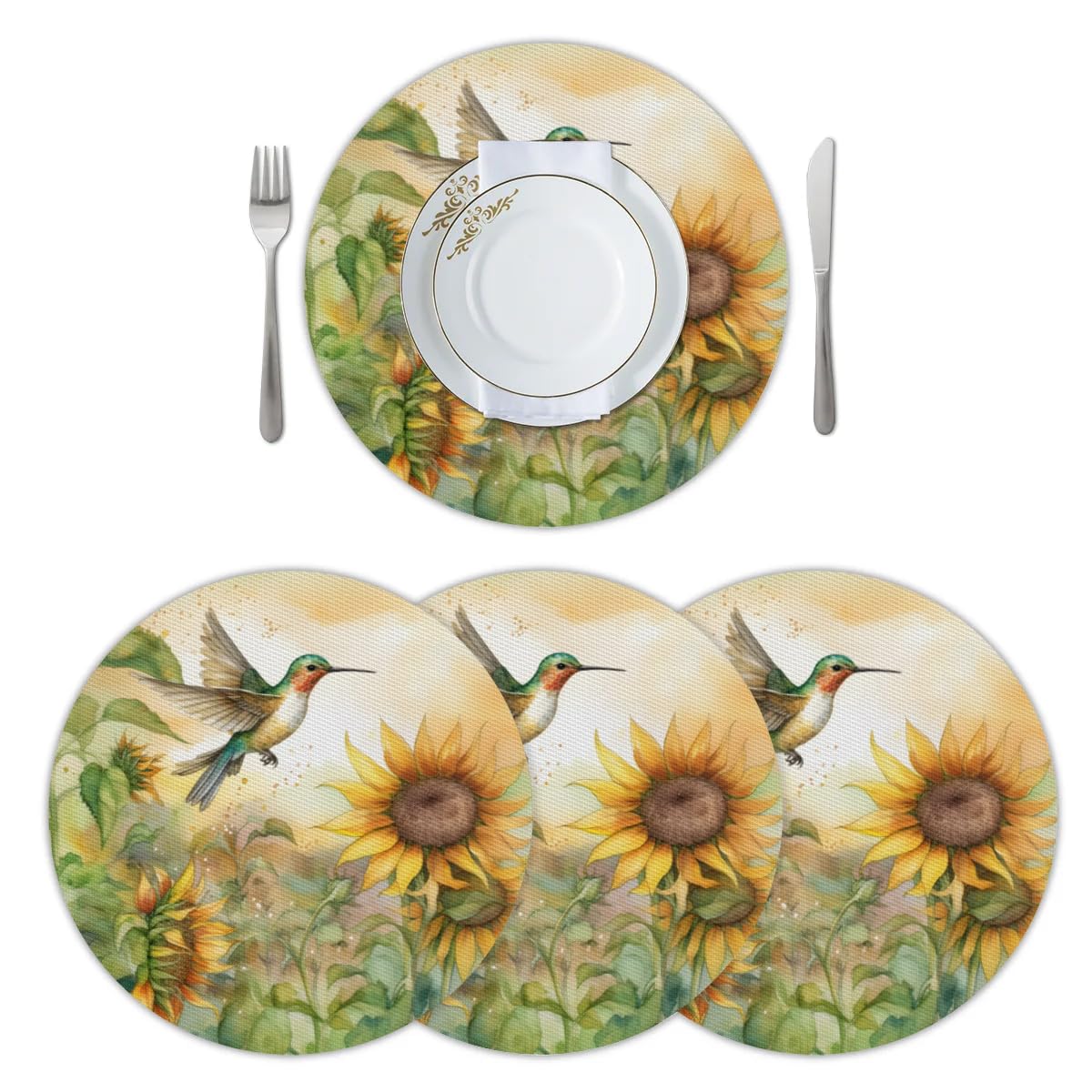 Juego de 4 manteles individuales redondos de girasol y pájaro, 15 pulgadas, lavables, resistentes al calor, para mesa de comedor d