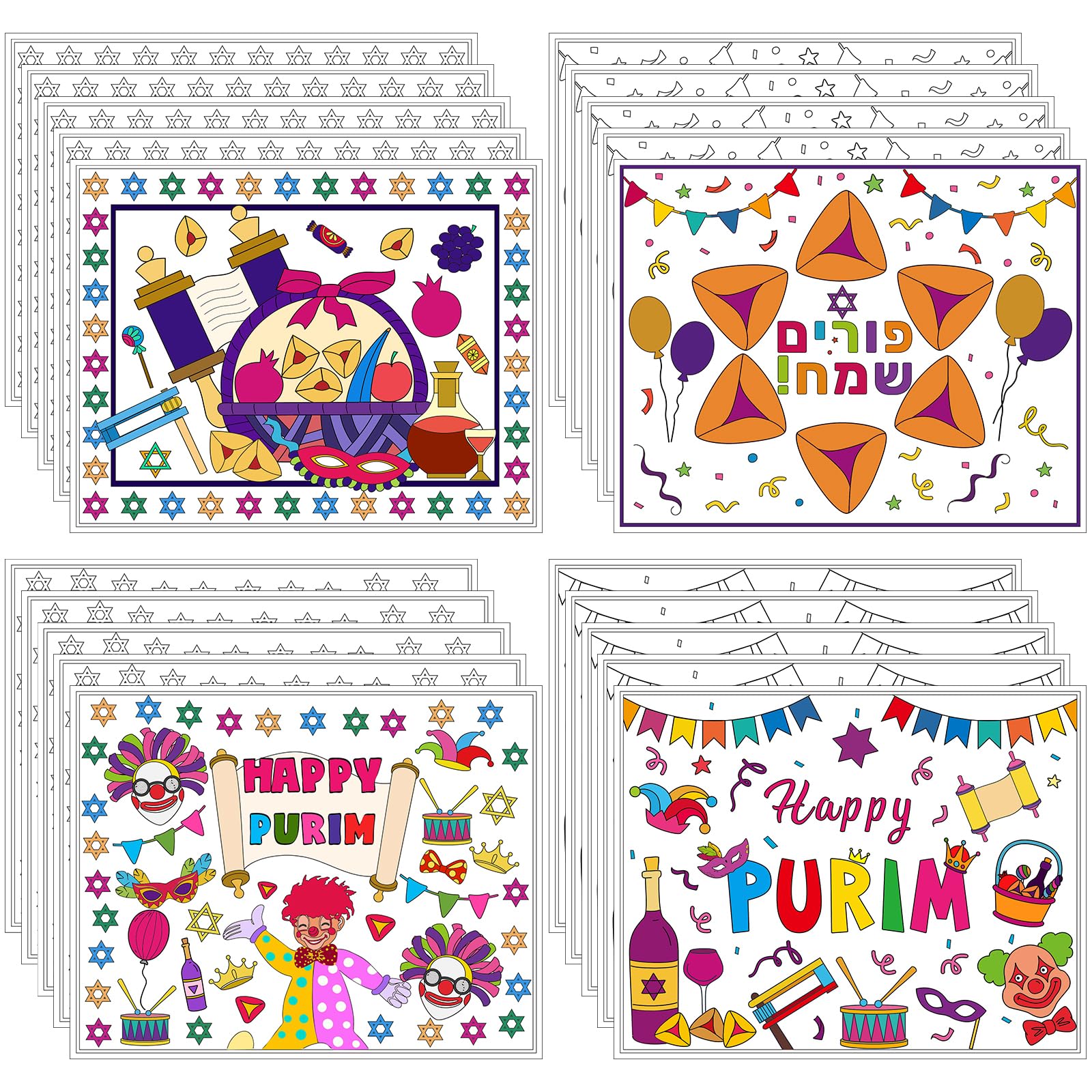 20 manteles individuales de papel para colorear Happy Purim, cuadrados, blancos, de 12 x 18 pulgadas, manteles individuales de mes