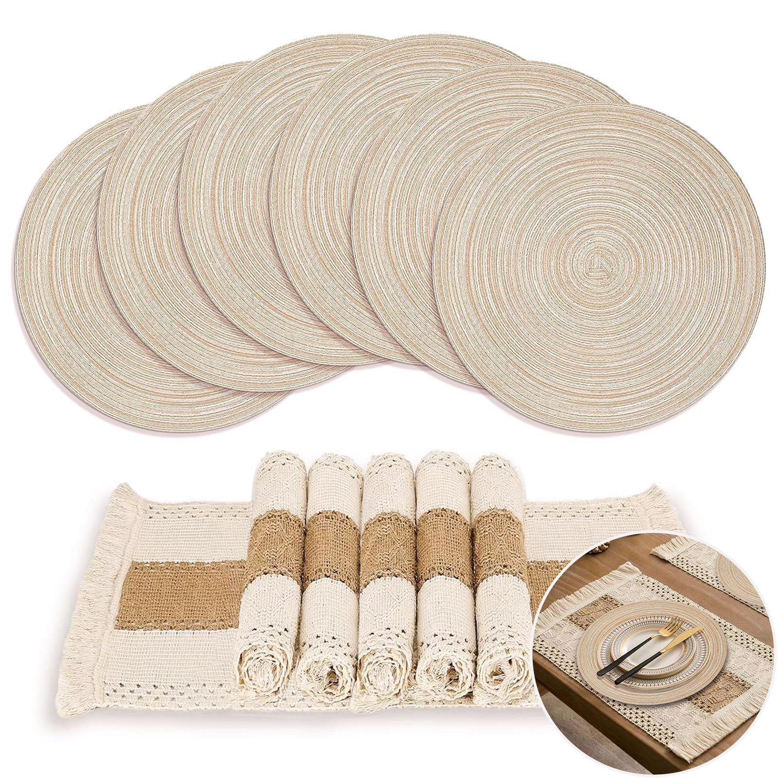 Juego de 6 manteles individuales de arpillera de algodón natural y manteles individuales redondos trenzados Doho, resistentes al c