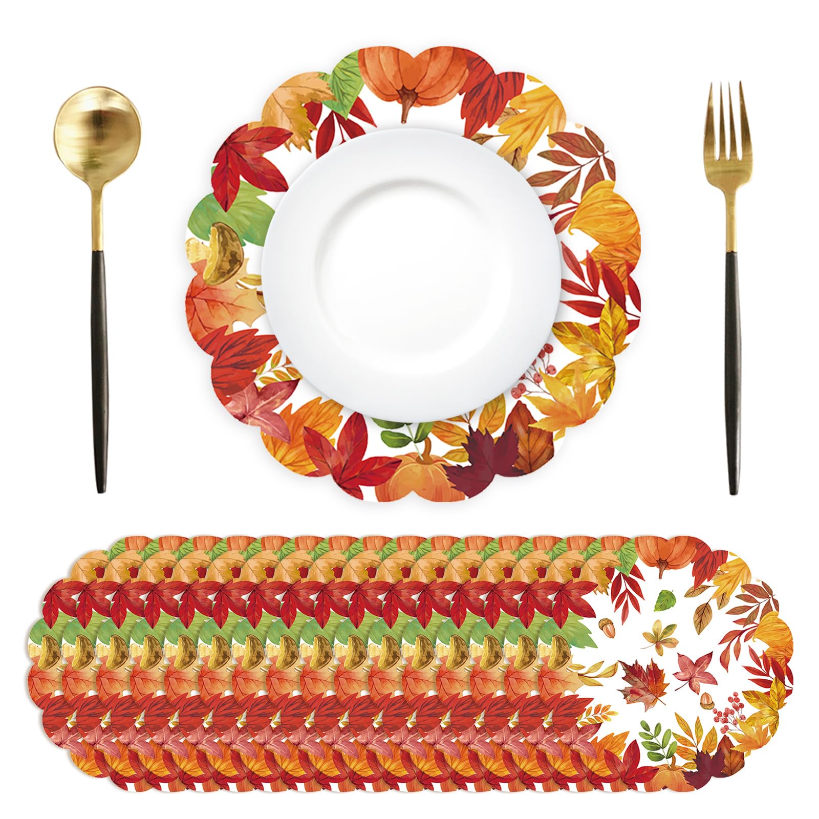 50Pcs Thanksgiving Fall Round Paper Placemats,13.4 Inch Autumn Maple Leaves Round Table Mats Fall Scalloped Disposable Placemats f