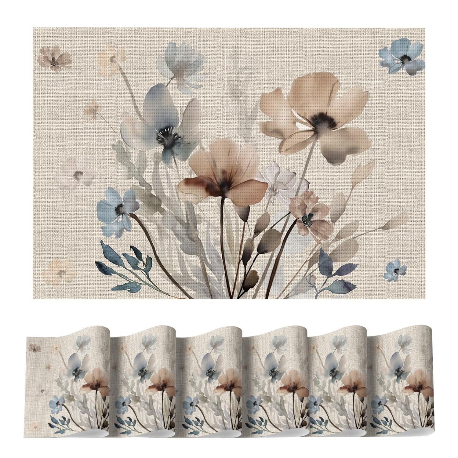 Artoid Mode Juego de 6 manteles individuales de vinilo con estampado floral de amapola marrón, manteles de PVC tejido de plástico