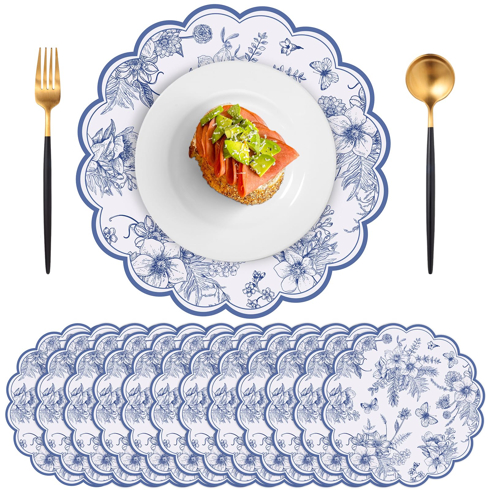 60 manteles individuales de papel floral azul, desechables de 13.5 pulgadas, manteles individuales festoneados para boda, manteles