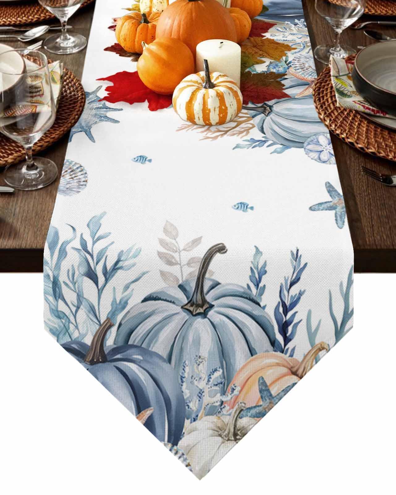 Blue Coastal Fall Table Runner 70 inches Long Thanksgiving Pumpkins Nautical Seahorse Coral Non-Slip Washable Burlap Table Linens