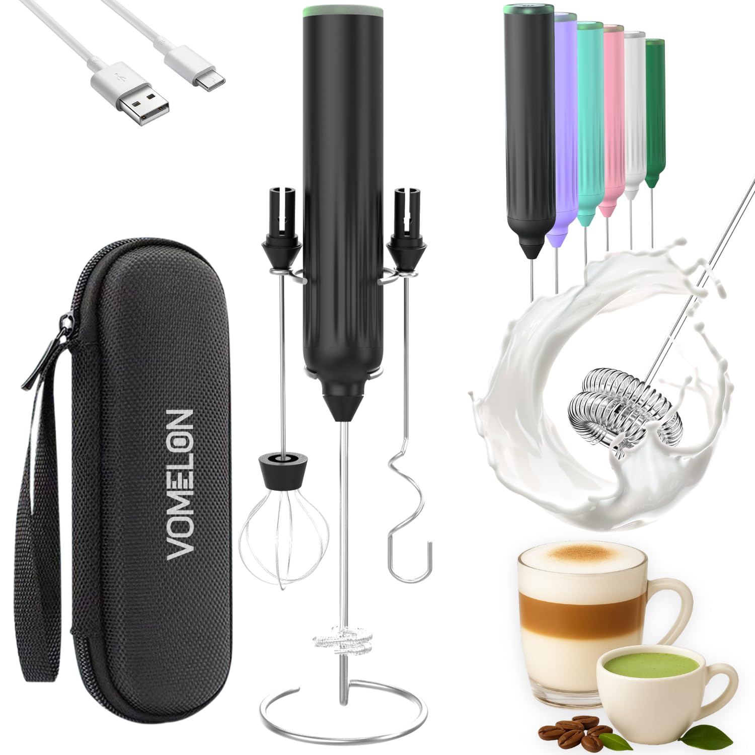 Nahida Espumador de leche verde granito para café, espumador de mano recargable batidor eléctrico con 3 cabezales, 3 velocidades,