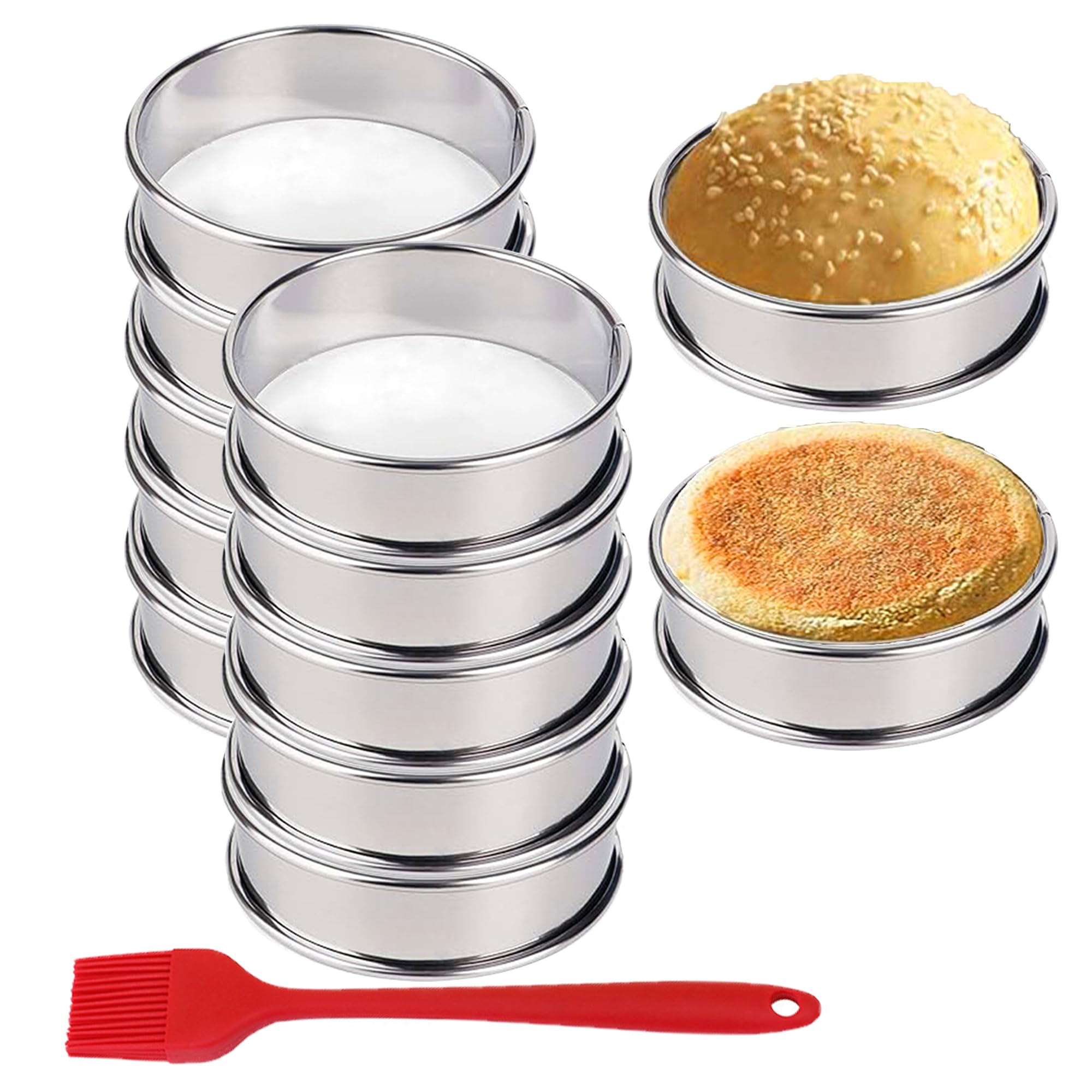 HLMOptimo Anillos para magdalenas inglesas, anillos de acero inoxidable, 12 moldes redondos de metal antiadherente con cepillo de