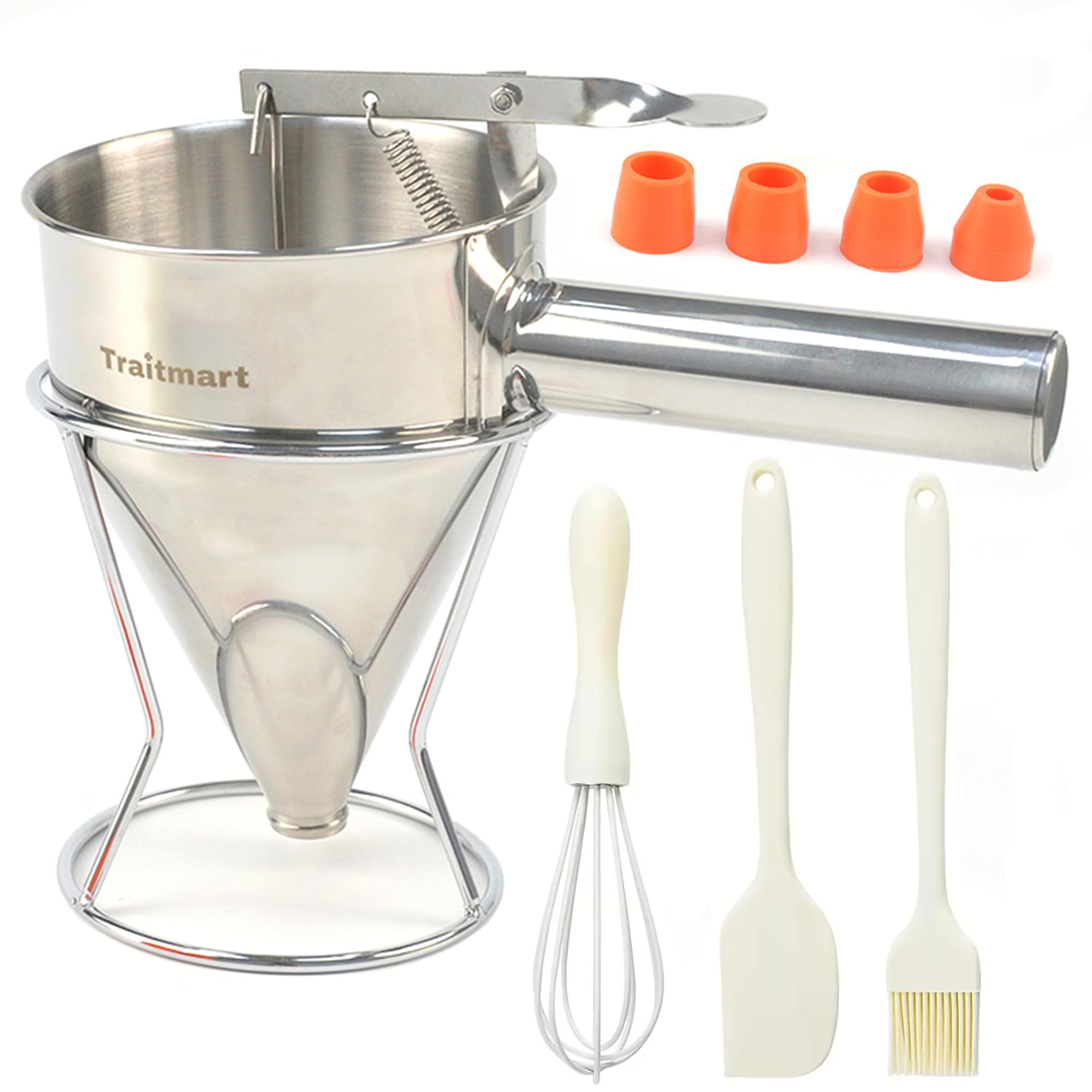 Dispensador de masa para panqueques de 20 onzas con mango para apretar, espátula, batidor y cepillo de repostería, embudo de acero