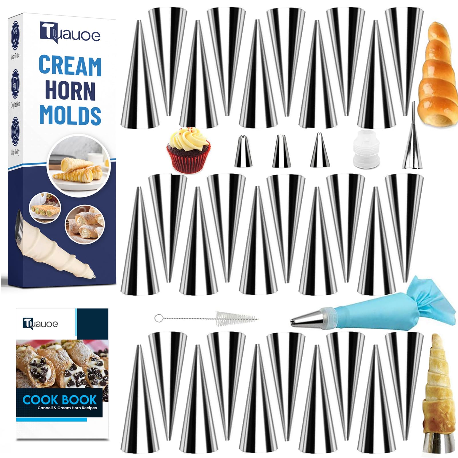 Moldes de cuerno de crema para hornear, juego de 38 piezas de forma de cuerno, antiadherentes de acero inoxidable, 30 piezas en fo
