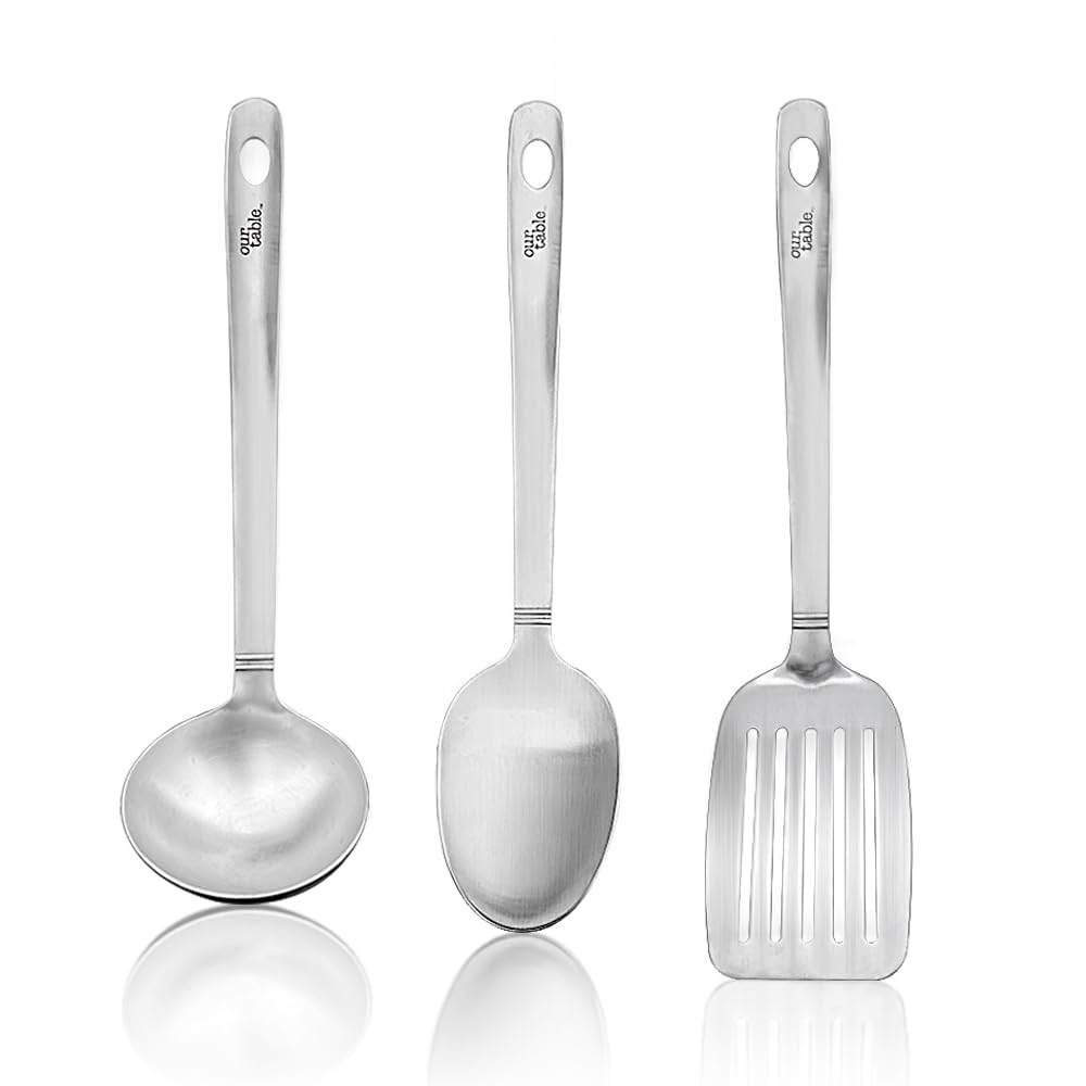 Our Table – Juego de utensilios de acero inoxidable para cocinar y servir de 3 piezas, cucharón de sopa de cocina, cuchara de coci