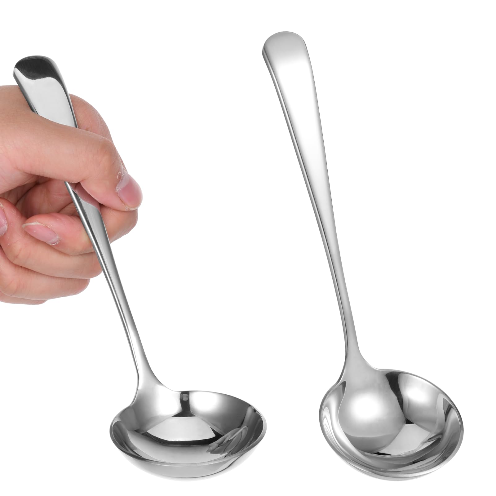 Paquete de 2 cucharones pequeños plateados de 7.9 pulgadas para sopa – Cucharón de salsa de acero inoxidable 18/10 para cucharas d