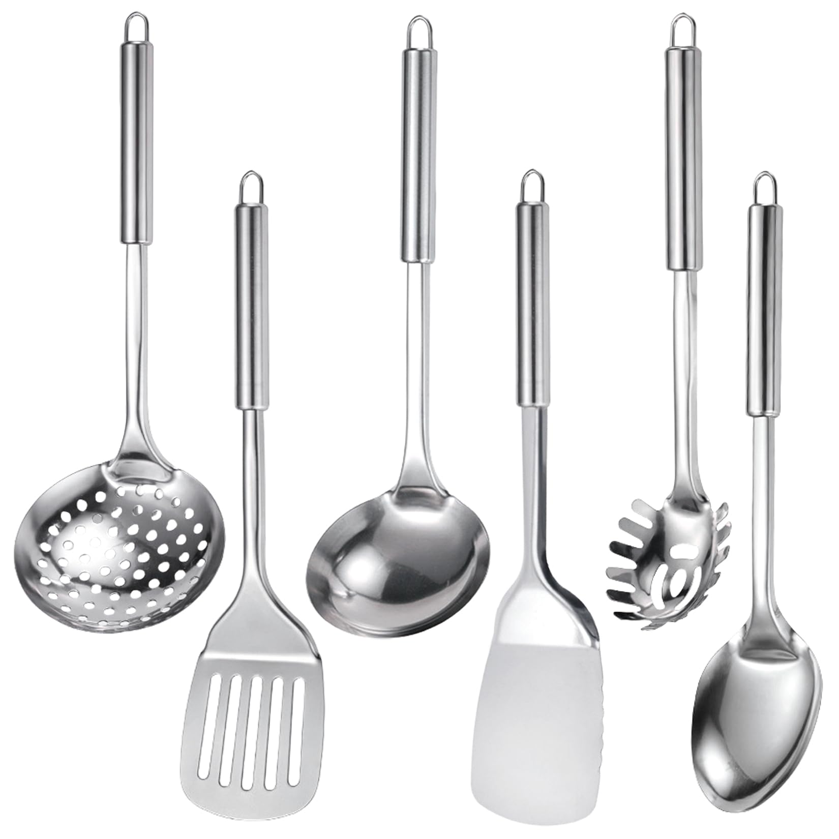 Utensilios de cocina de acero inoxidable 304, juego de 6 utensilios de cocina con espátula, cuchara sólida, cucharón, espumador, c