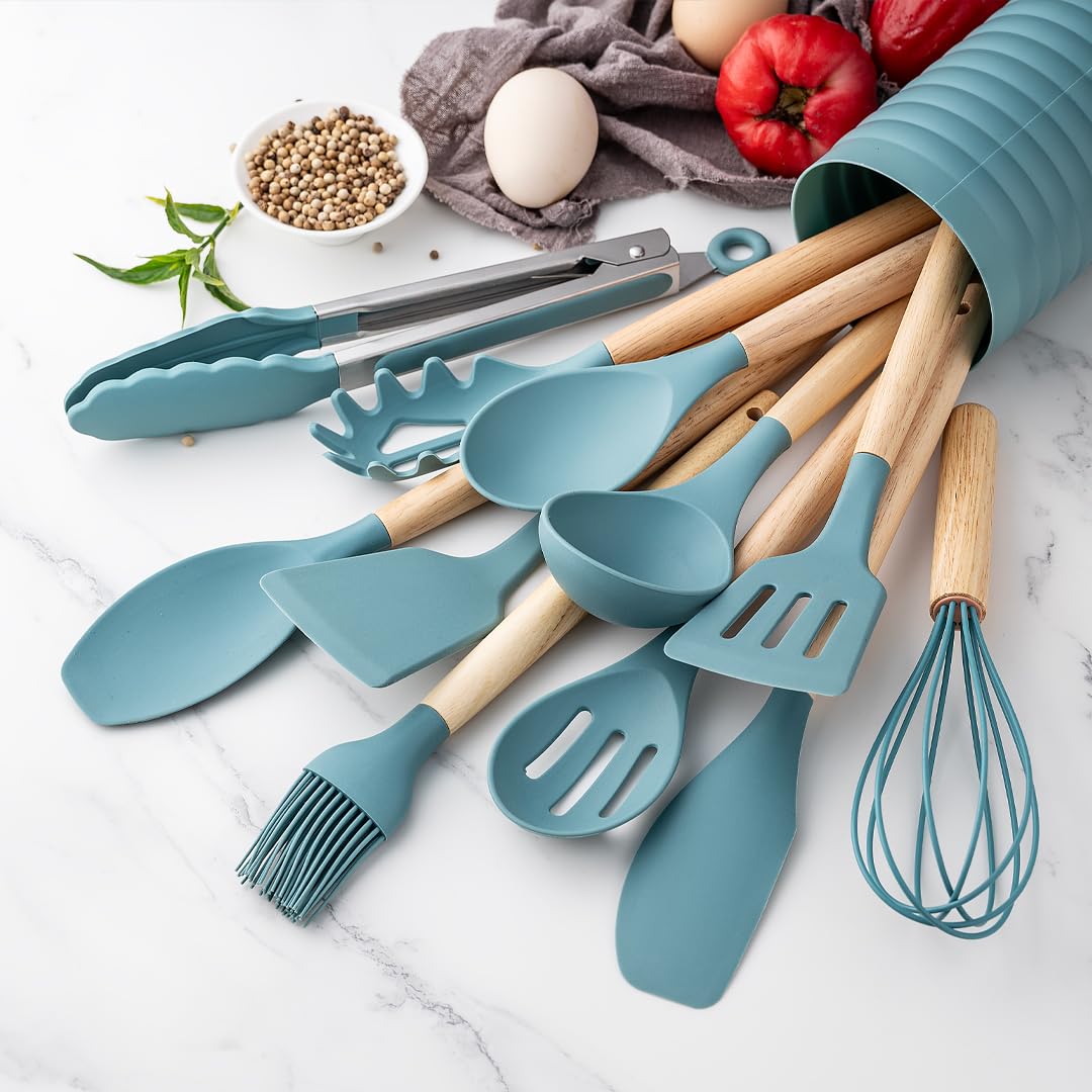 KSENDALO Aqua – Juego de utensilios de cocina pequeños de silicona de 12 piezas con soporte, herramientas de cocina con mango de m