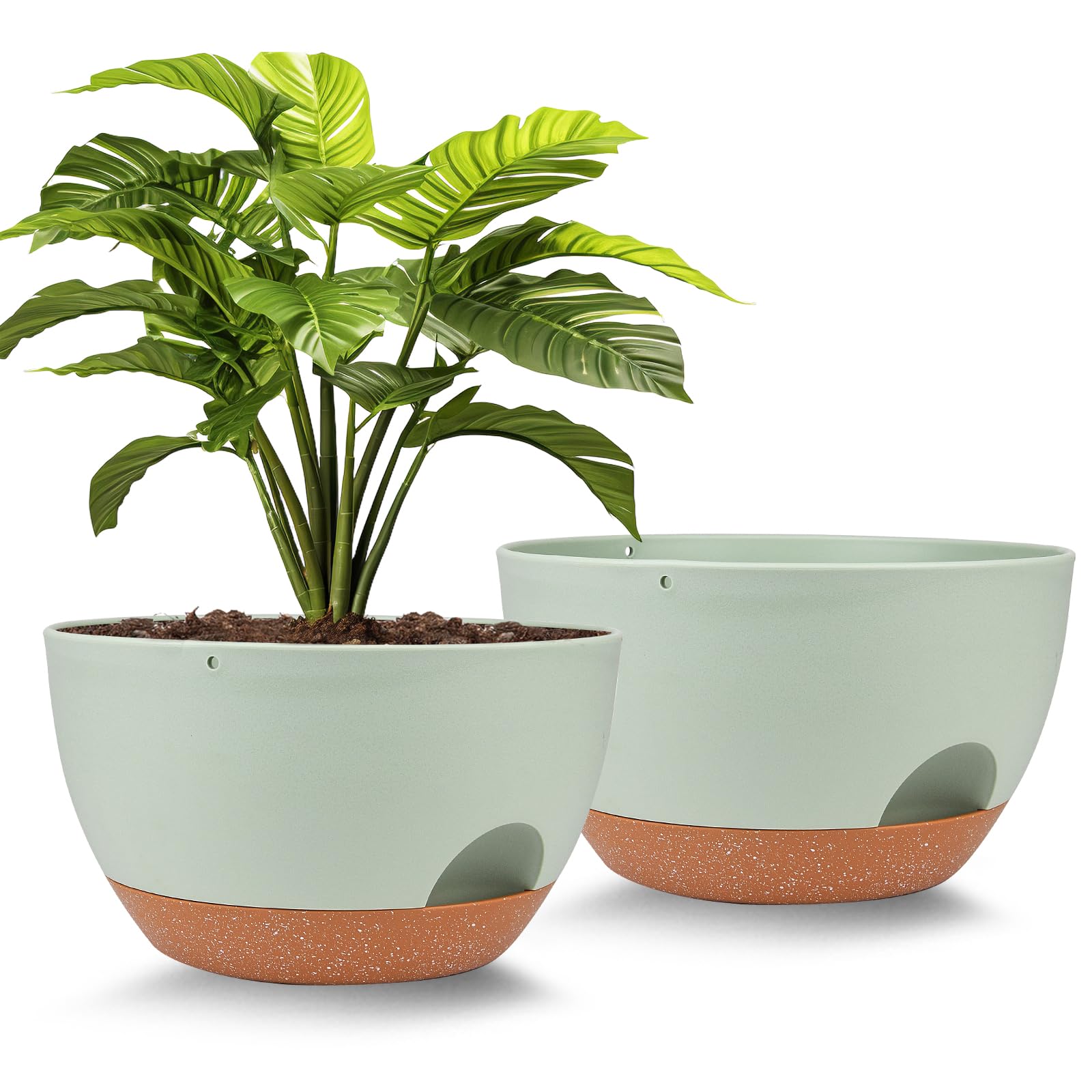 Macetas de riego automático de 12 pulgadas, juego de 2 macetas de plástico con agujeros de drenaje y platillos, macetas para plant