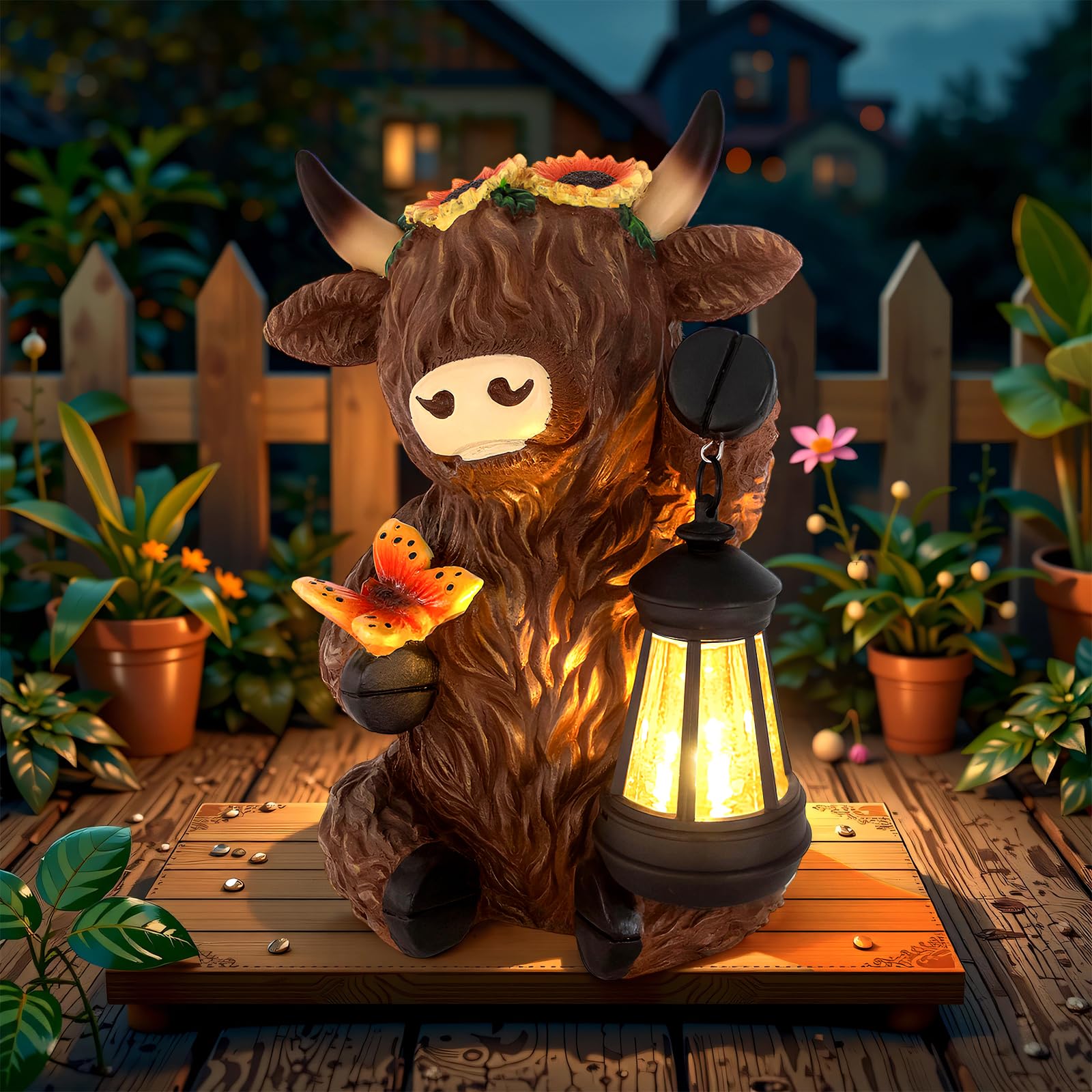 Estatuas solares de vaca de las tierras altas para jardín, decoración exterior con dorsal para patio, césped, porche, patio, balcó