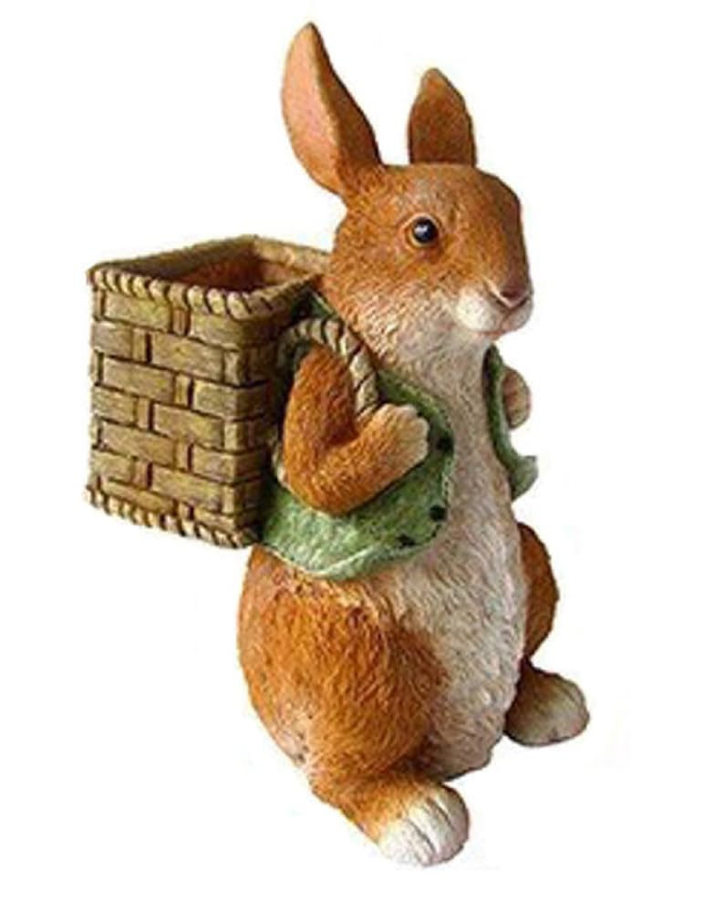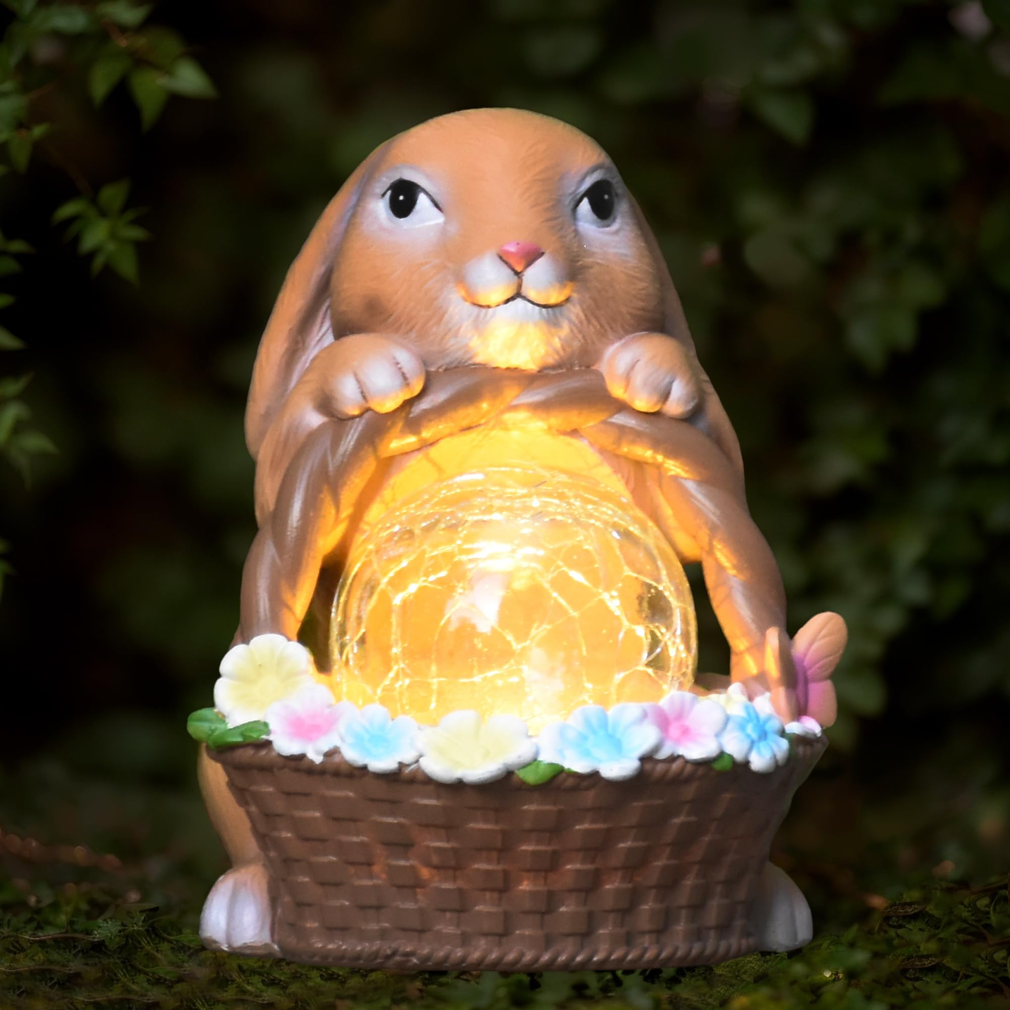 Decoración solar de jardín, estatua de jardín de conejo, decoración de Pascua, cesta de flores de resina, estatuas solares de cone