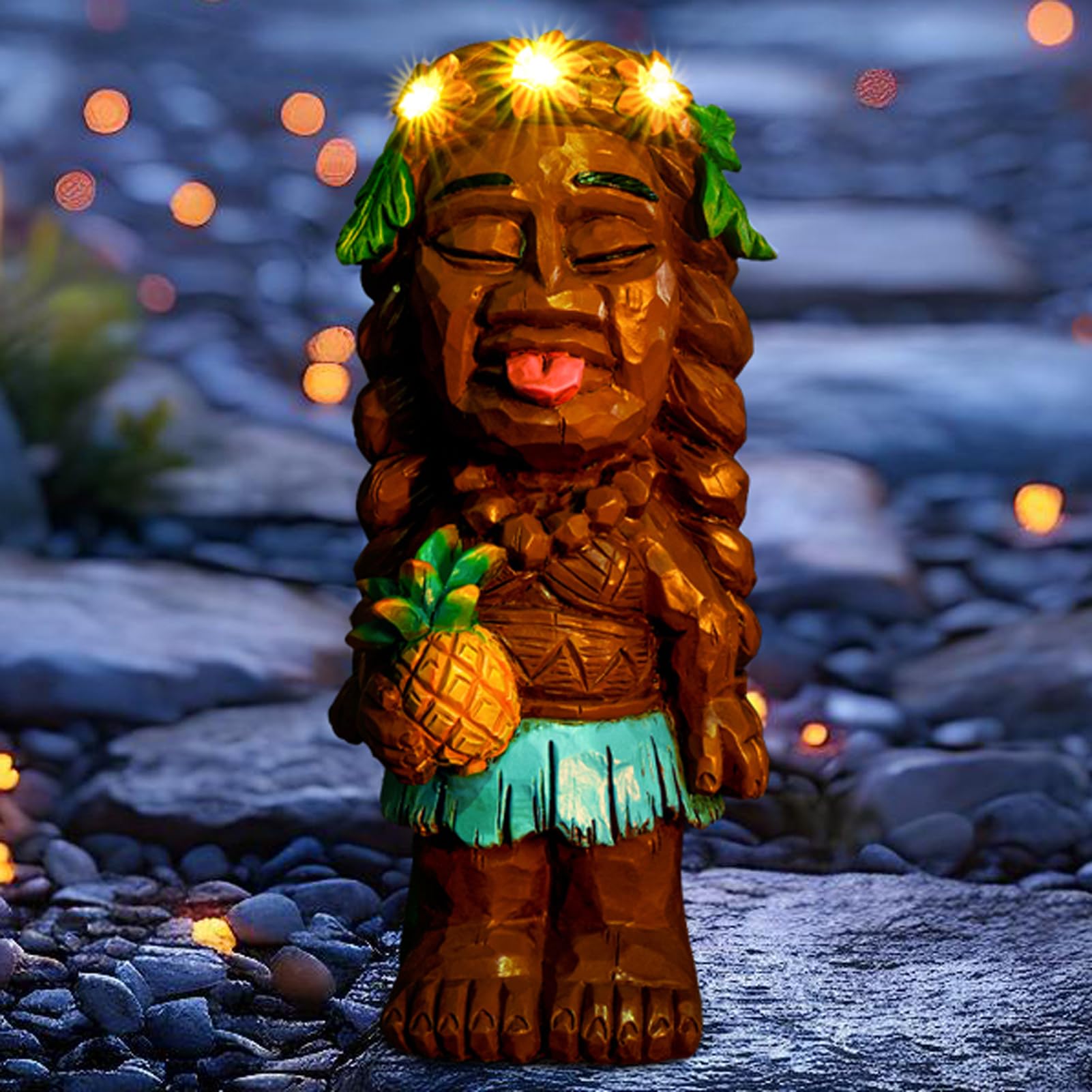 Estatuas solares de Tiki Girl Garden Statues Tiki Lady Holding Pineapple Figurine with Flower LED Lights Bar Patio Pórtico Césped