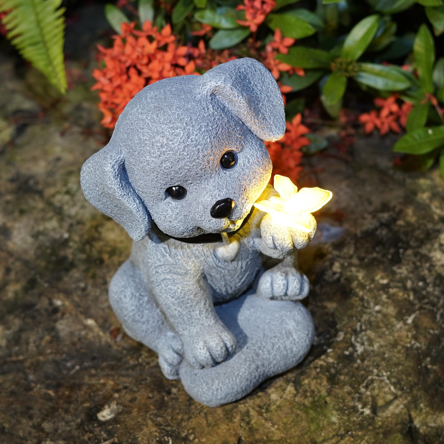 Estatua solar de perro con mariposa – Decoración de jardín al aire libre para el hogar, patio, balcón o porche – Regalo ideal para