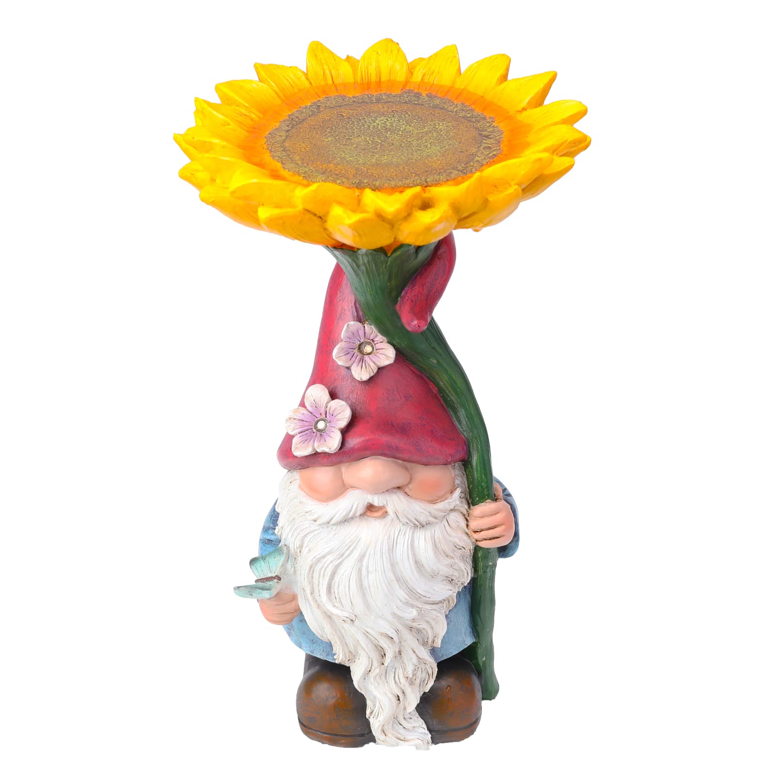 MUMTOP Estatua de gnomo de jardín con girasol para baño de pájaros, decoración al aire libre, comedero de pájaros de gnomo con luz