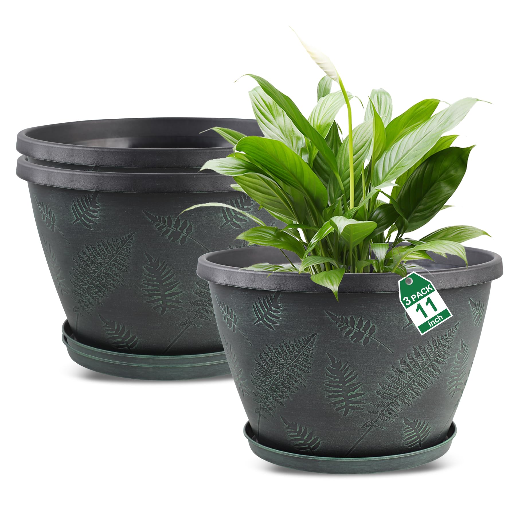 Juego de 3 macetas de 11 pulgadas, macetas de plástico con orificio de drenaje y bandeja, macetas redondas decorativas para planta