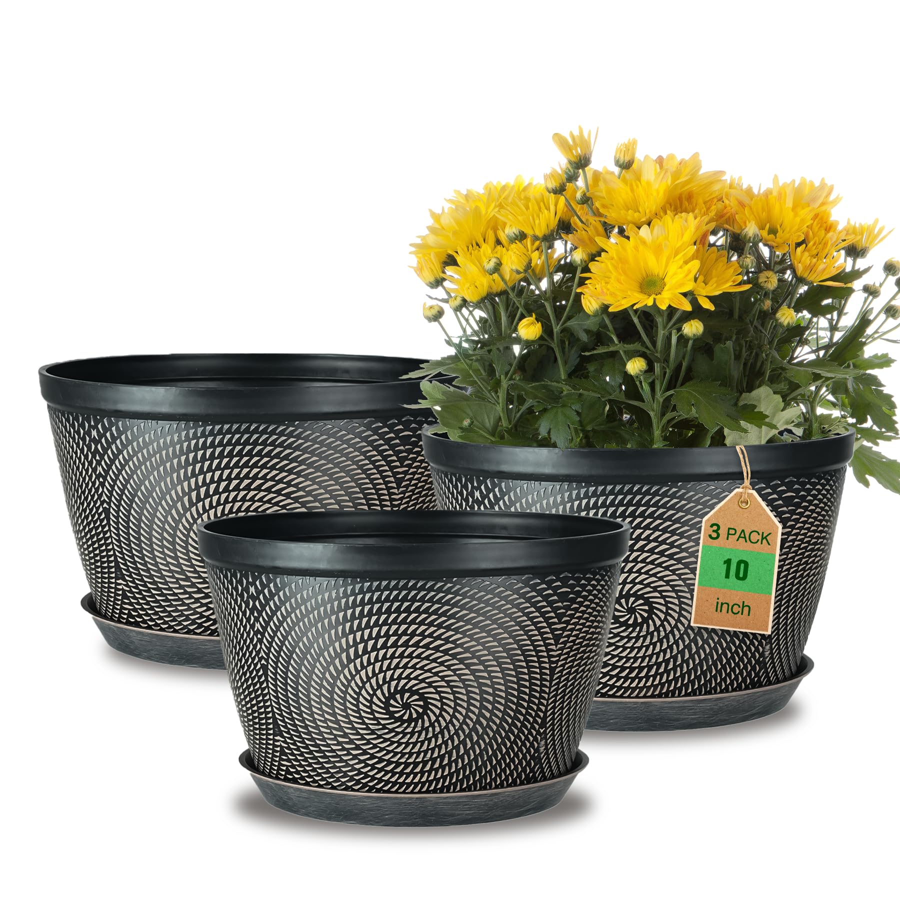 Quarut Macetas de 10 pulgadas para interiores y exteriores, paquete de 3 macetas de plástico con orificio de drenaje y bandeja, ma