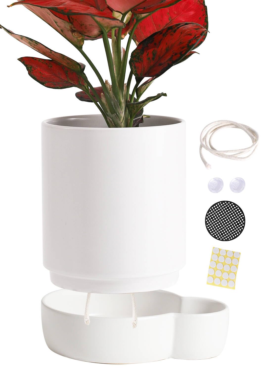 TAMAYKIM Macetas de riego automático de 5.5 pulgadas con cuerda, maceta cilíndrica redonda de cerámica con orificio de drenaje, de