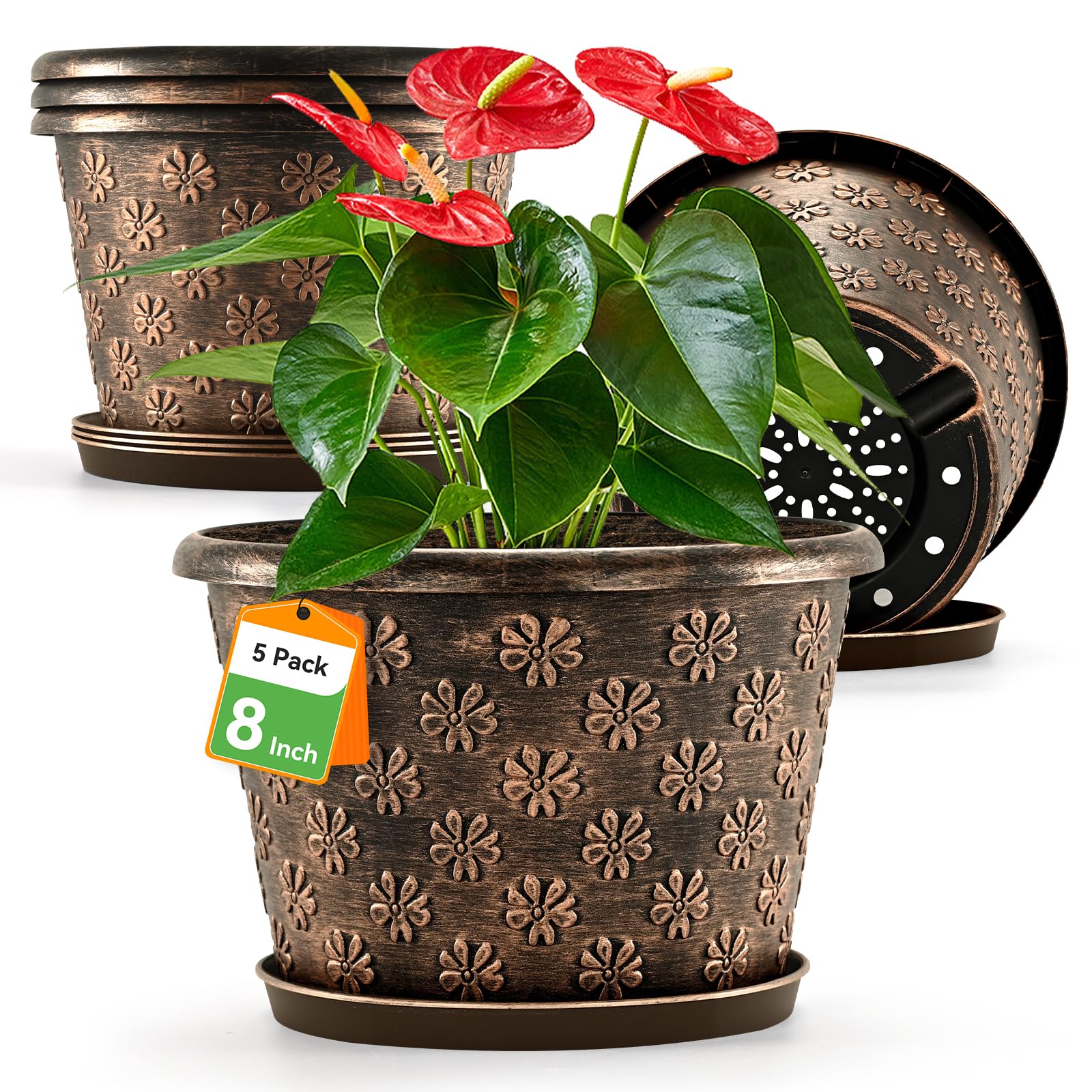 Macetas de 8 pulgadas para plantas, macetas de plástico para interiores y exteriores, paquete de 5 macetas de resina con drenaje y