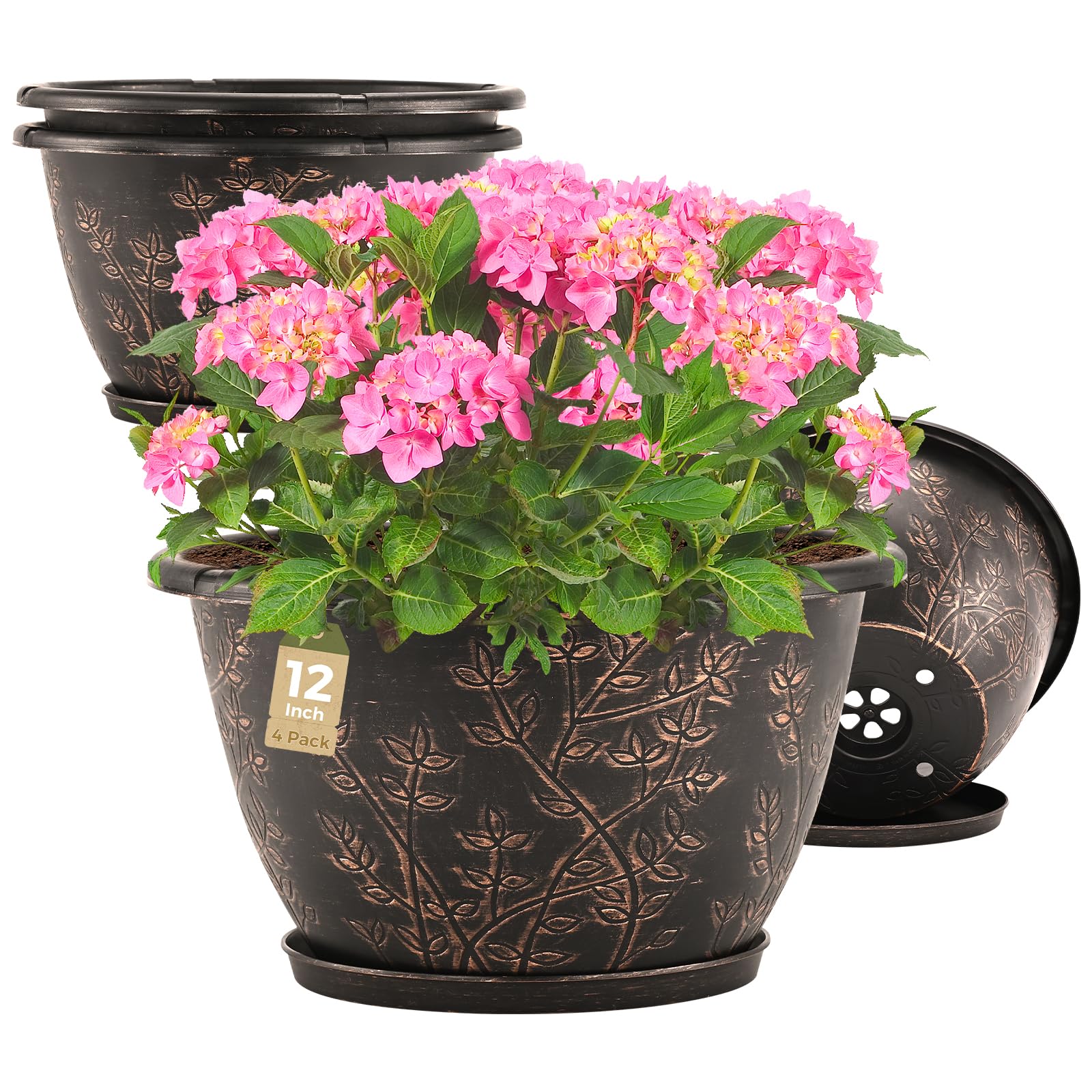 Macetas de plástico de 12 pulgadas para exteriores e interiores, paquete de 4 macetas de plástico para plantas con platillo de ori