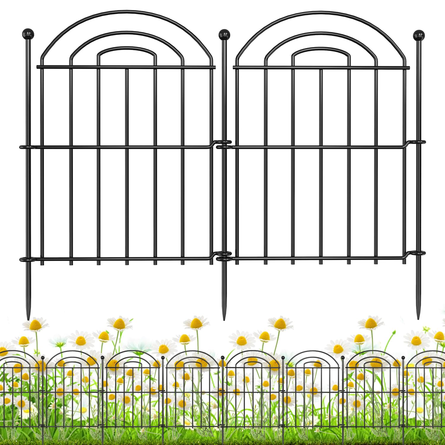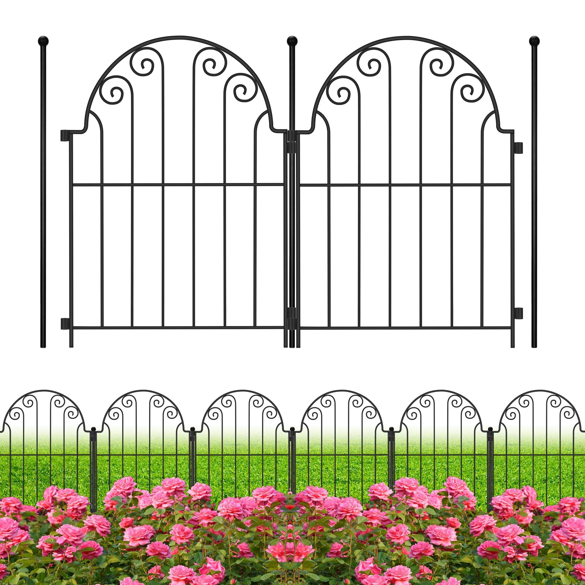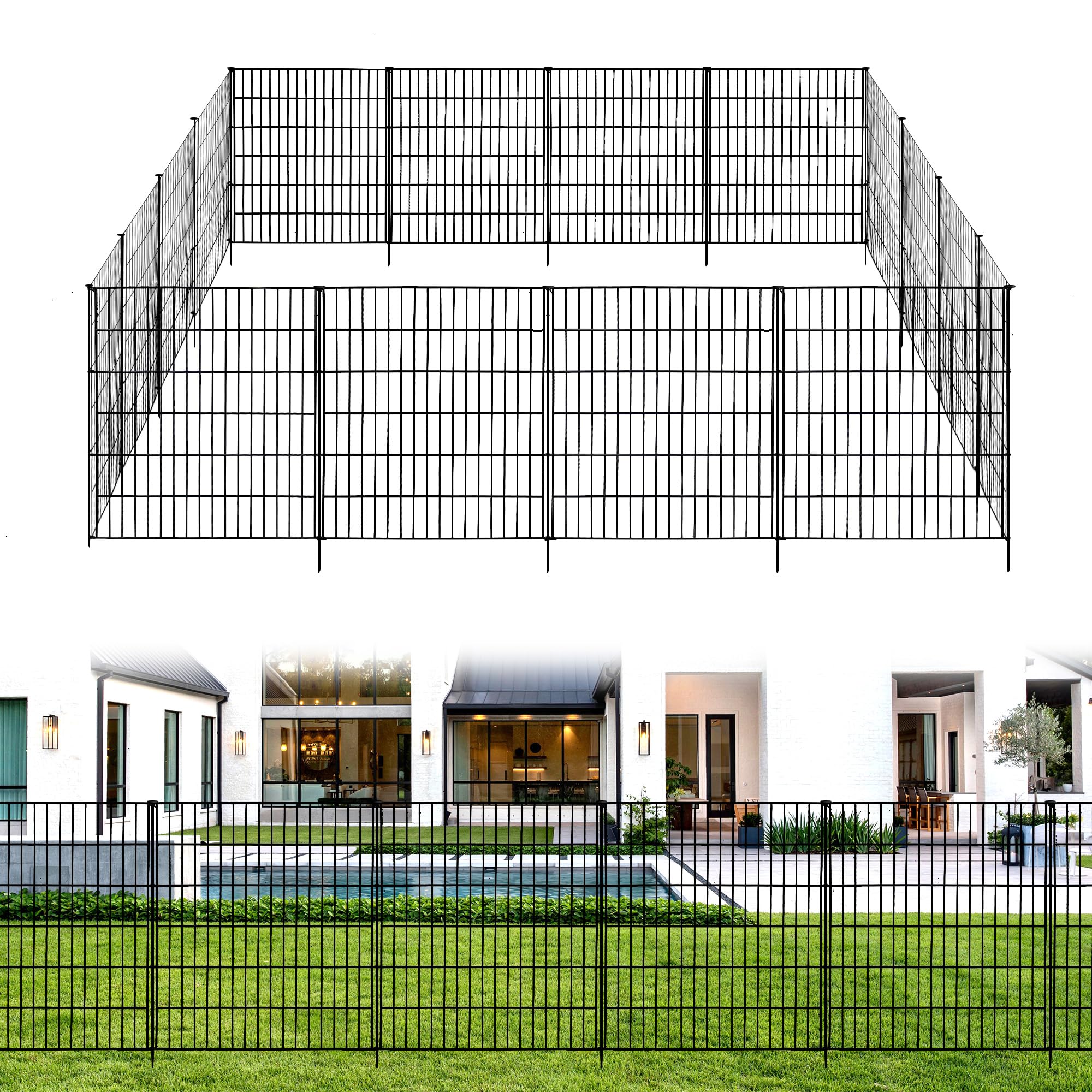 Valla decorativa de jardín con puerta, 10 paneles sin excavación, 32 pulgadas de alto x 22.5 pies de largo, tubo cuadrado reforzad