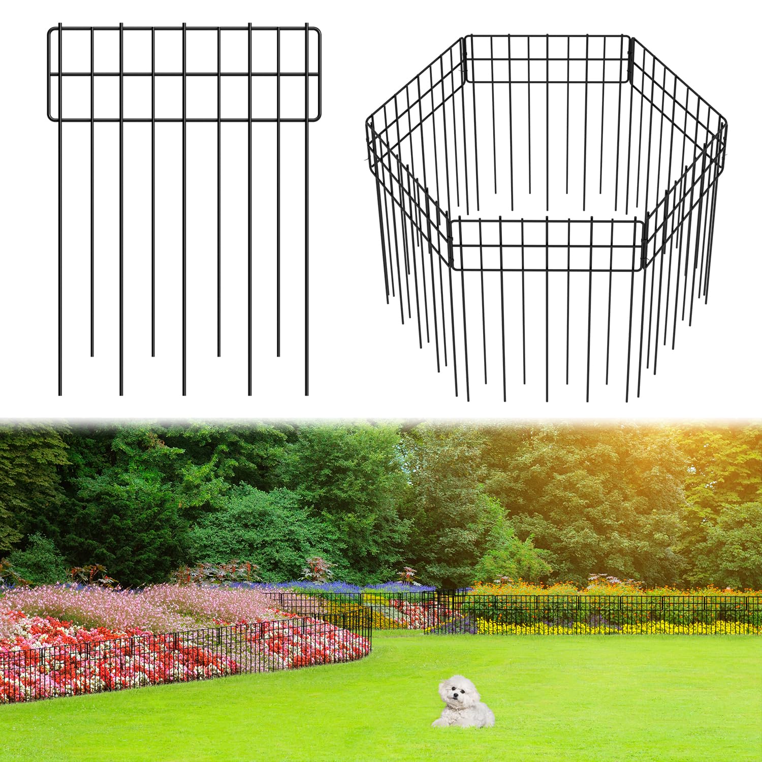 Valla decorativa de jardín, 10 paneles, valla de metal inoxidable sin excavación de 11 pies de largo para perros, valla de jardín