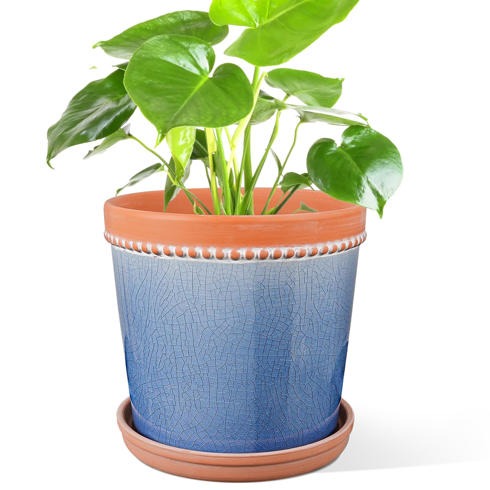 KERUITA Maceta de cerámica de 8 pulgadas con drenaje y platillo – Crackle Glaze Blue, maceta grande para plantas de interior, mace