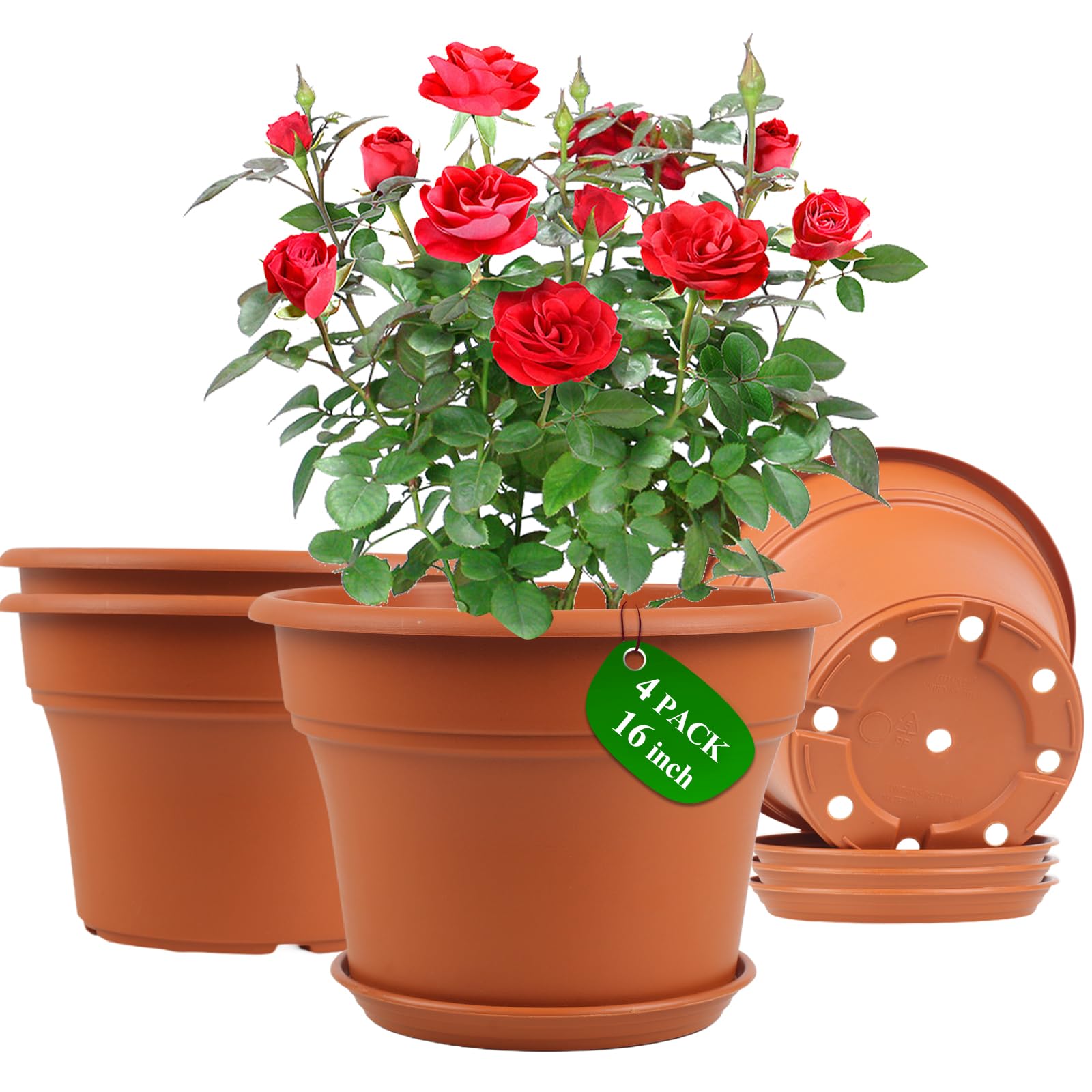 Maceta de plástico de 16 pulgadas para plantas de interior, paquete de 4 macetas grandes para exteriores con agujeros de drenaje y