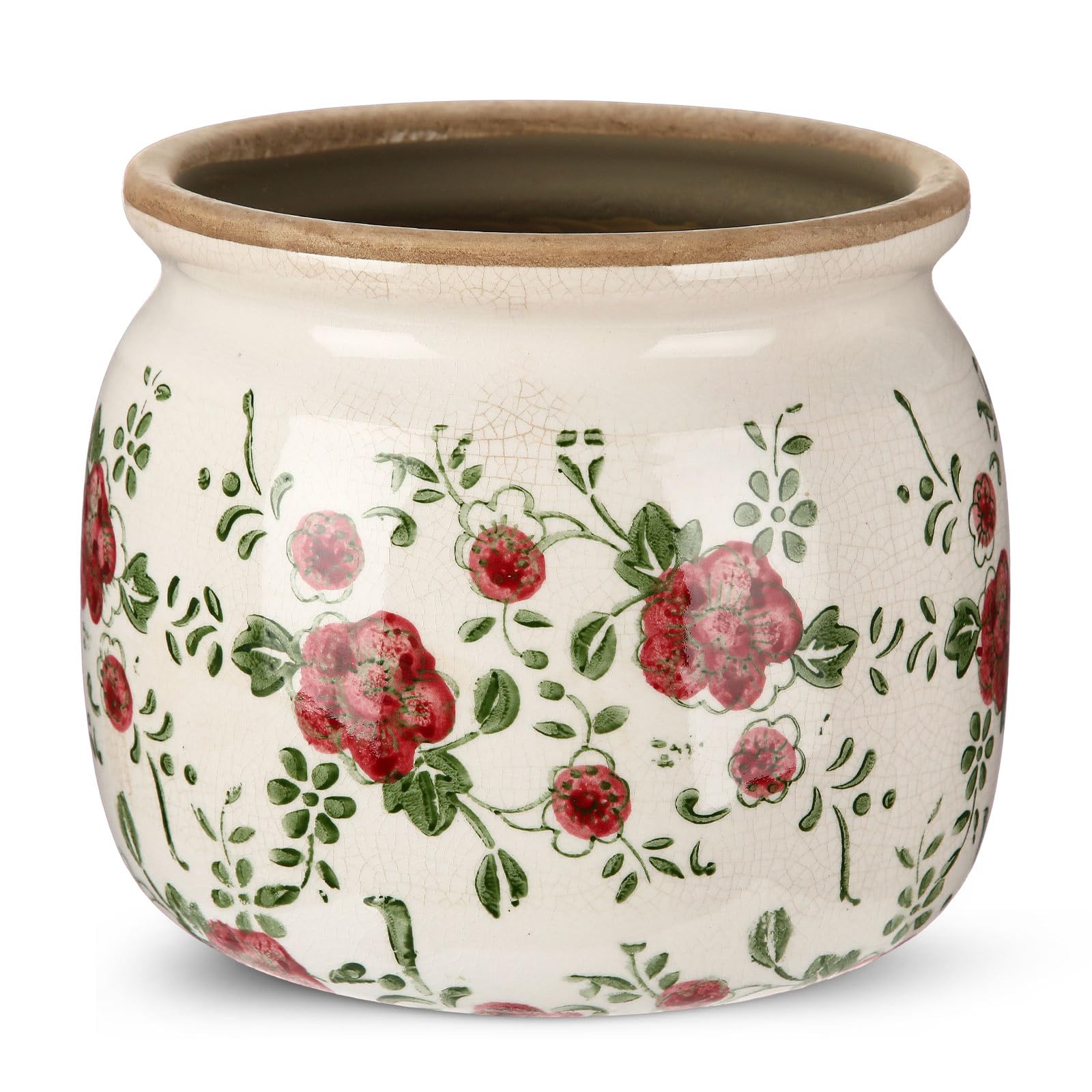 Maceta vintage de cerámica de 5.1 pulgadas con patrón rústico de rosas silvestres, gran pergamino, jarrón para plantas de interior