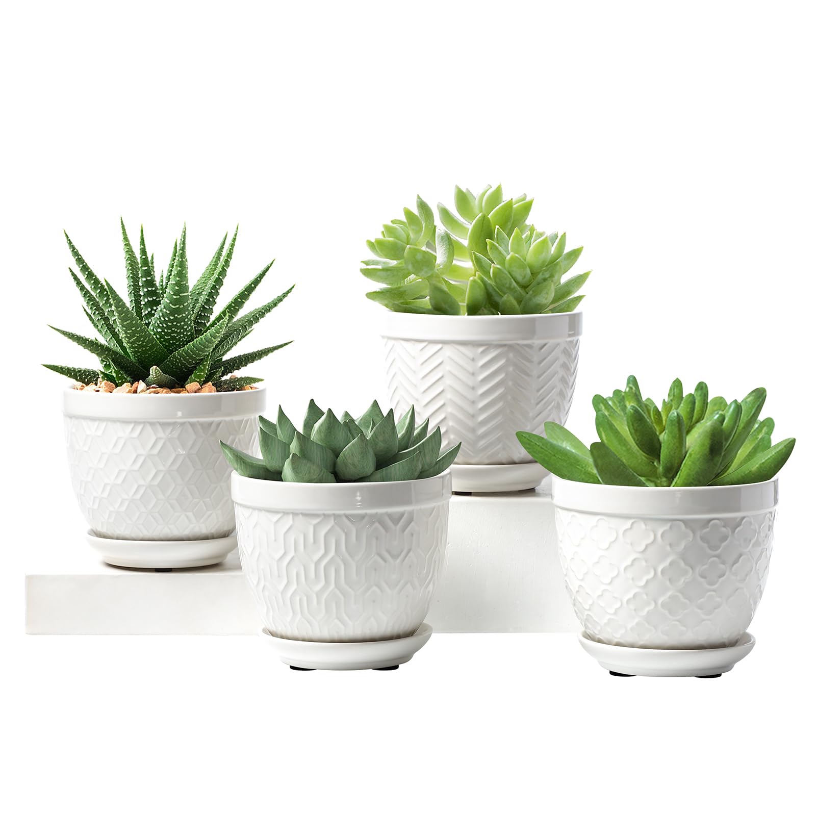 Sureasy – Macetas de cerámica de 4.7 pulgadas para plantas de interior, macetas para suculentas con platillo y orificio de drenaje