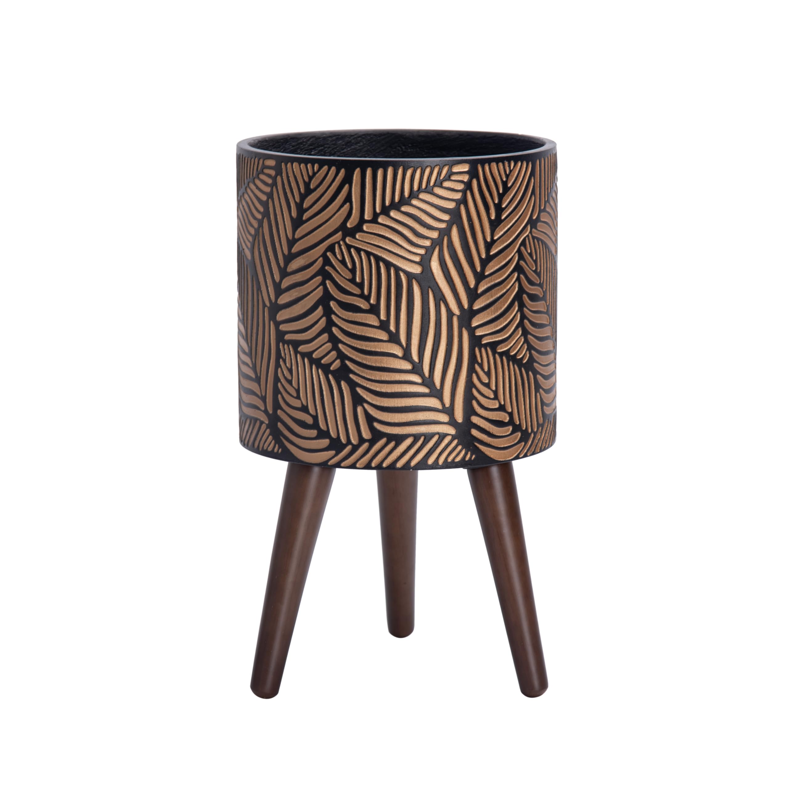 Macetero alto de interior con soporte, diseño de hojas, macizo, vertical con orificio de drenaje, M, Bronce/Gris