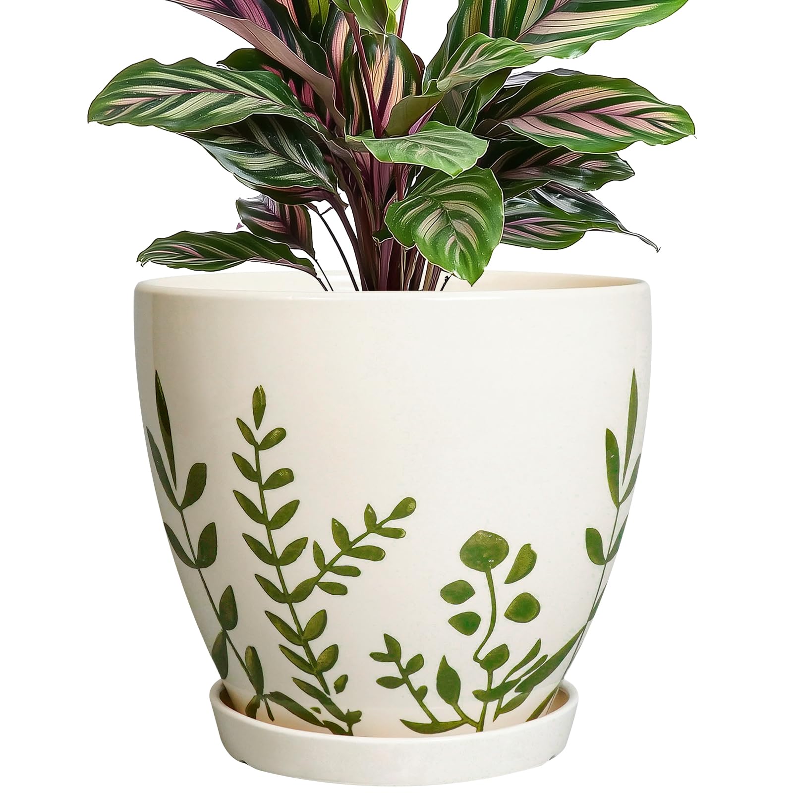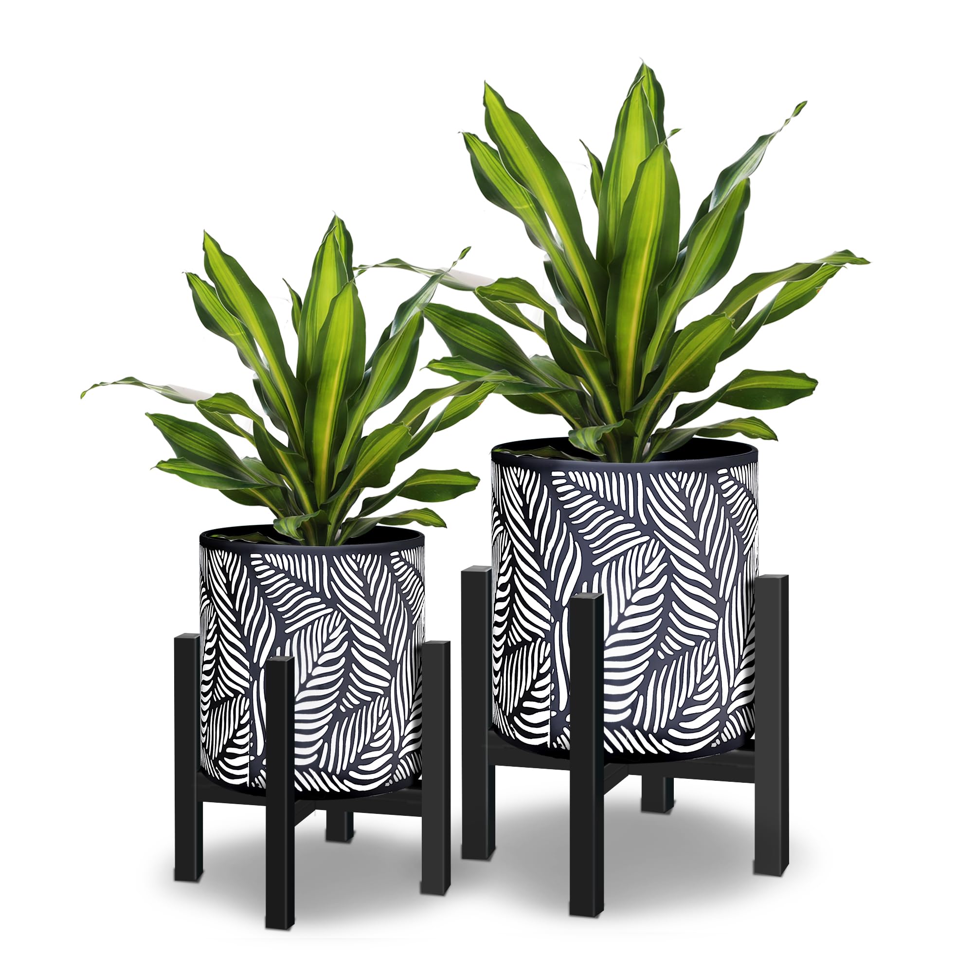 Maceta de 10 y 12 pulgadas con soporte, juego de 2, maceta decorativa de impresión de hojas de palma con soporte, maceta de jardín
