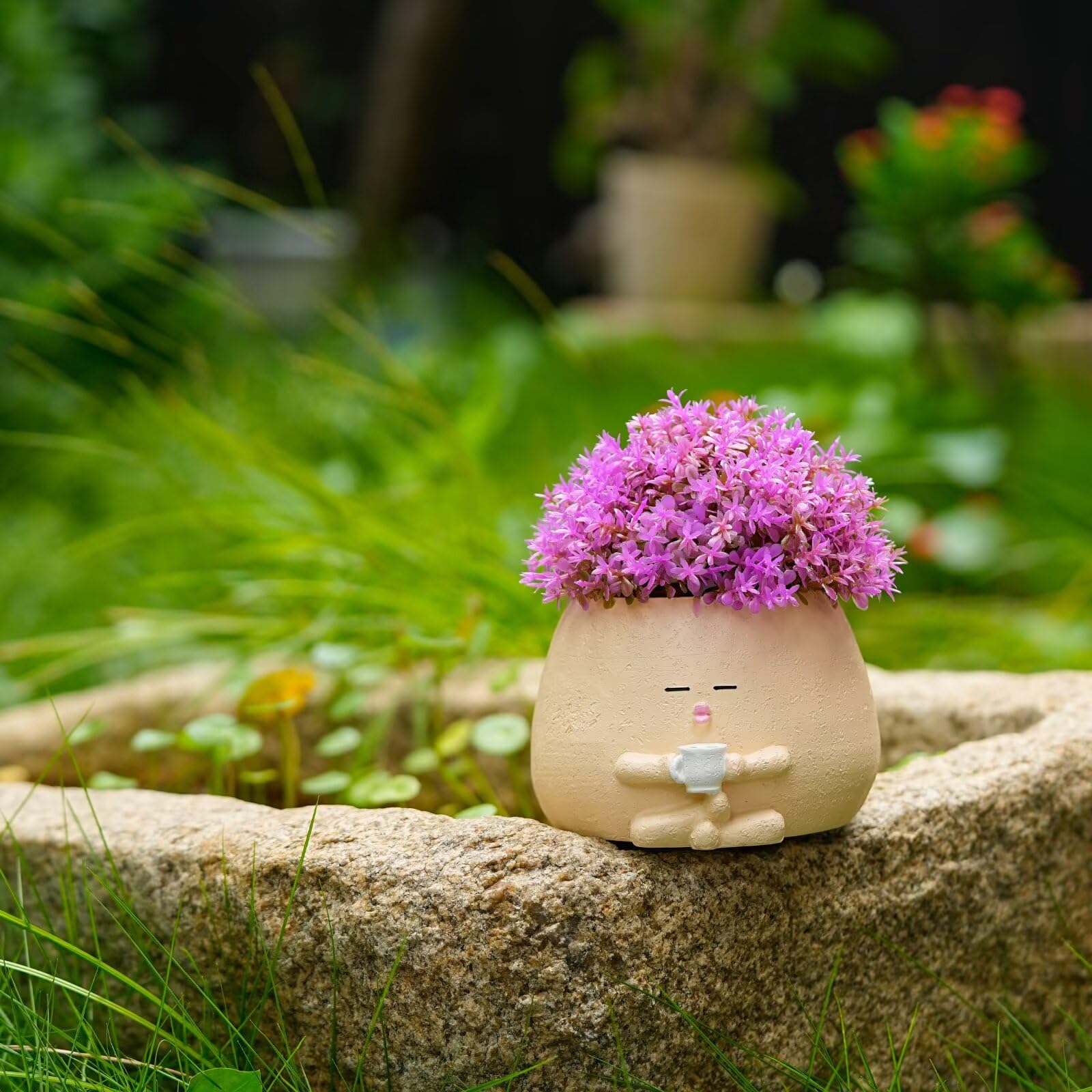 Smily – Maceta con taza de café, bonita resina con cabeza de flor para interiores y exteriores, macetas únicas para suculentas con