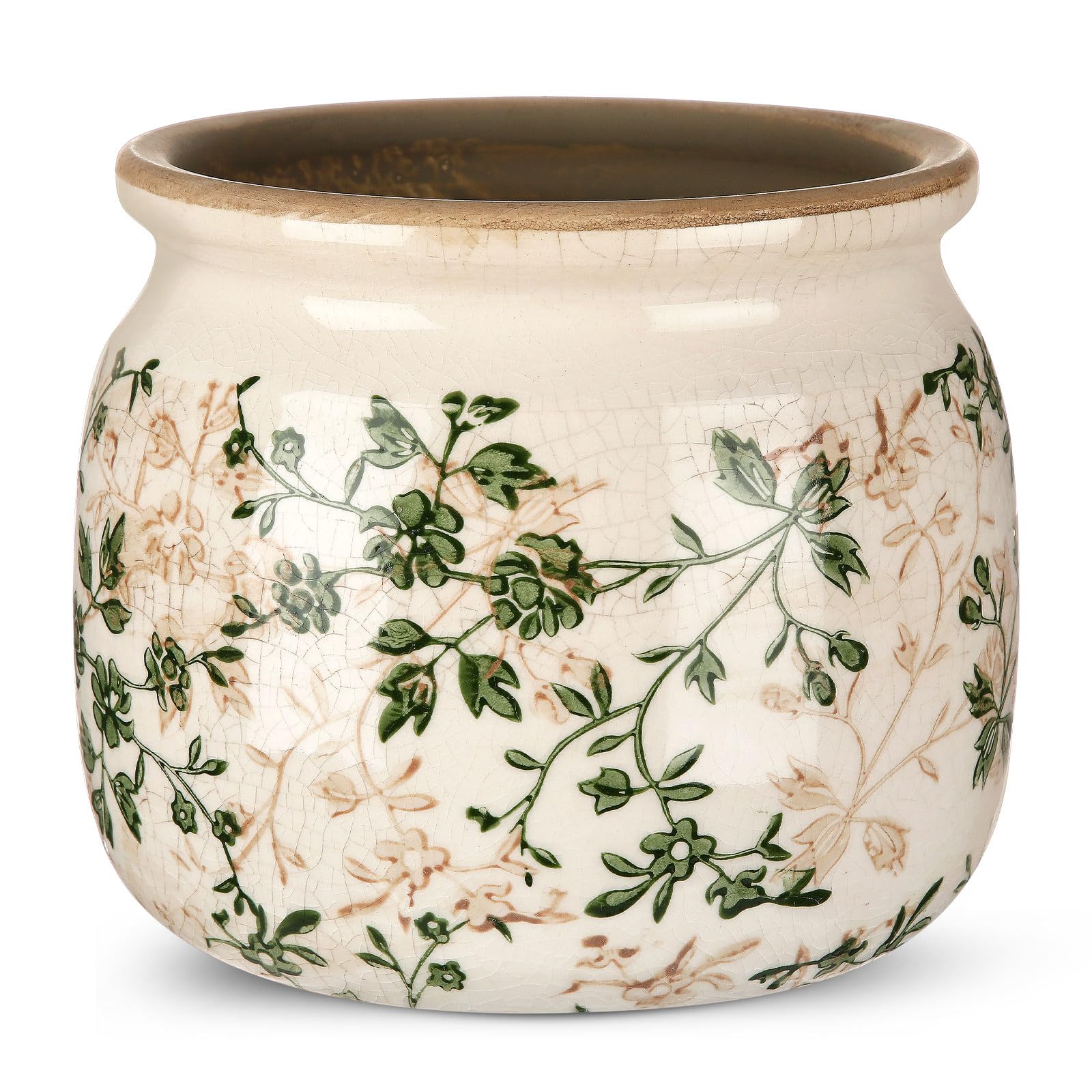 Florero de cerámica de 5.1 pulgadas, macetas rústicas de flores pastorales beige y verde, maceta con acabado esmaltado agrietado p