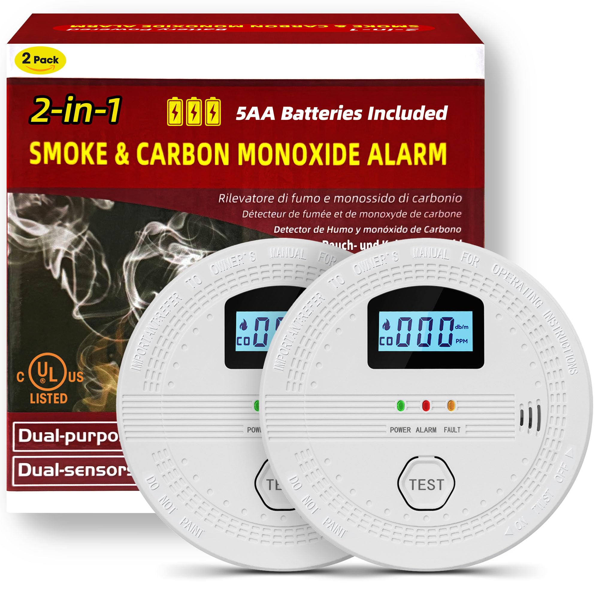 Detector de humo, detector de monóxido de carbono, batería de 10 años con alertas de voz bilingües, UL 217-9º estándar alarma de h