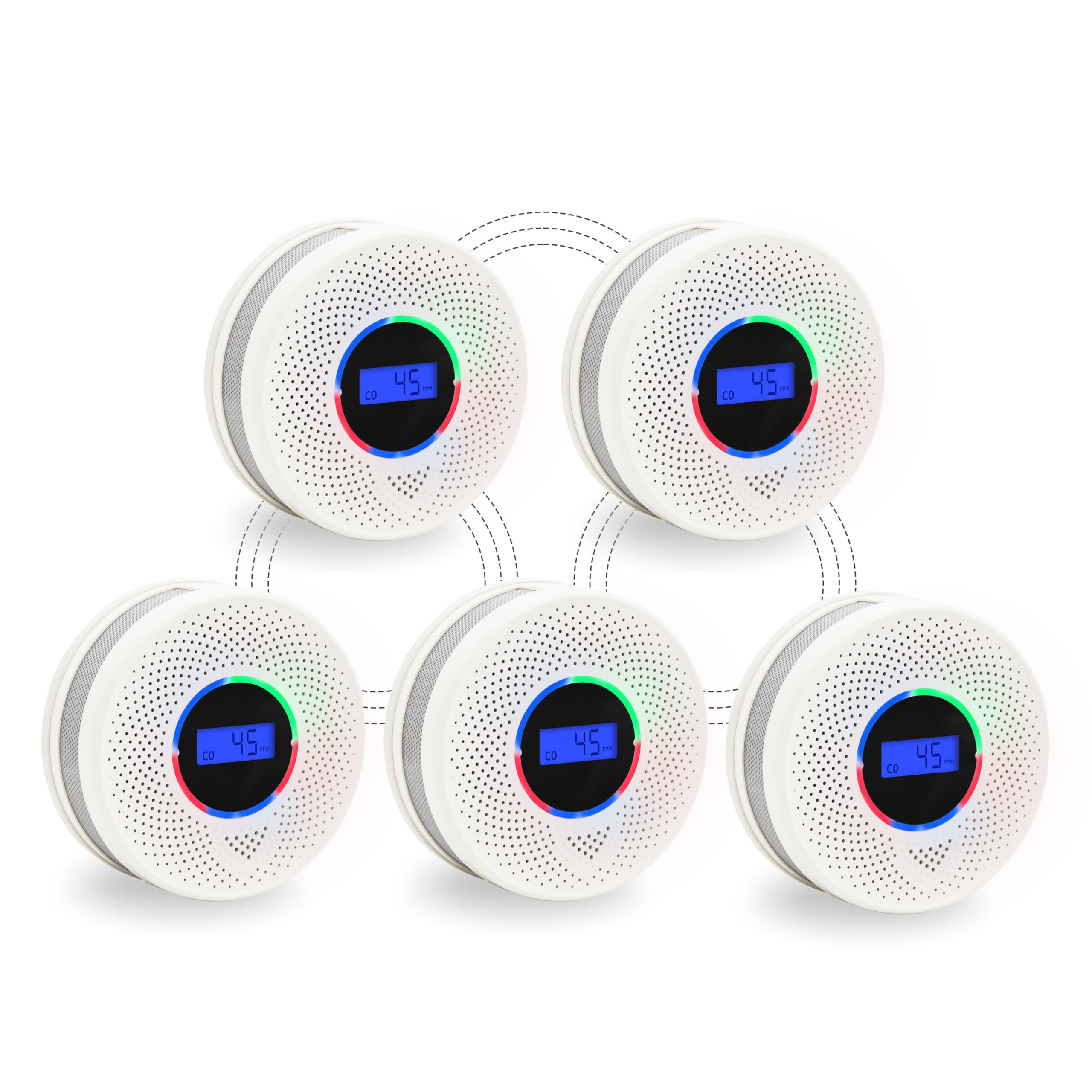 Paquete de 5 detectores de monóxido de carbono de humo interconectados mejorados, alimentado por batería e inalámbrico interconect
