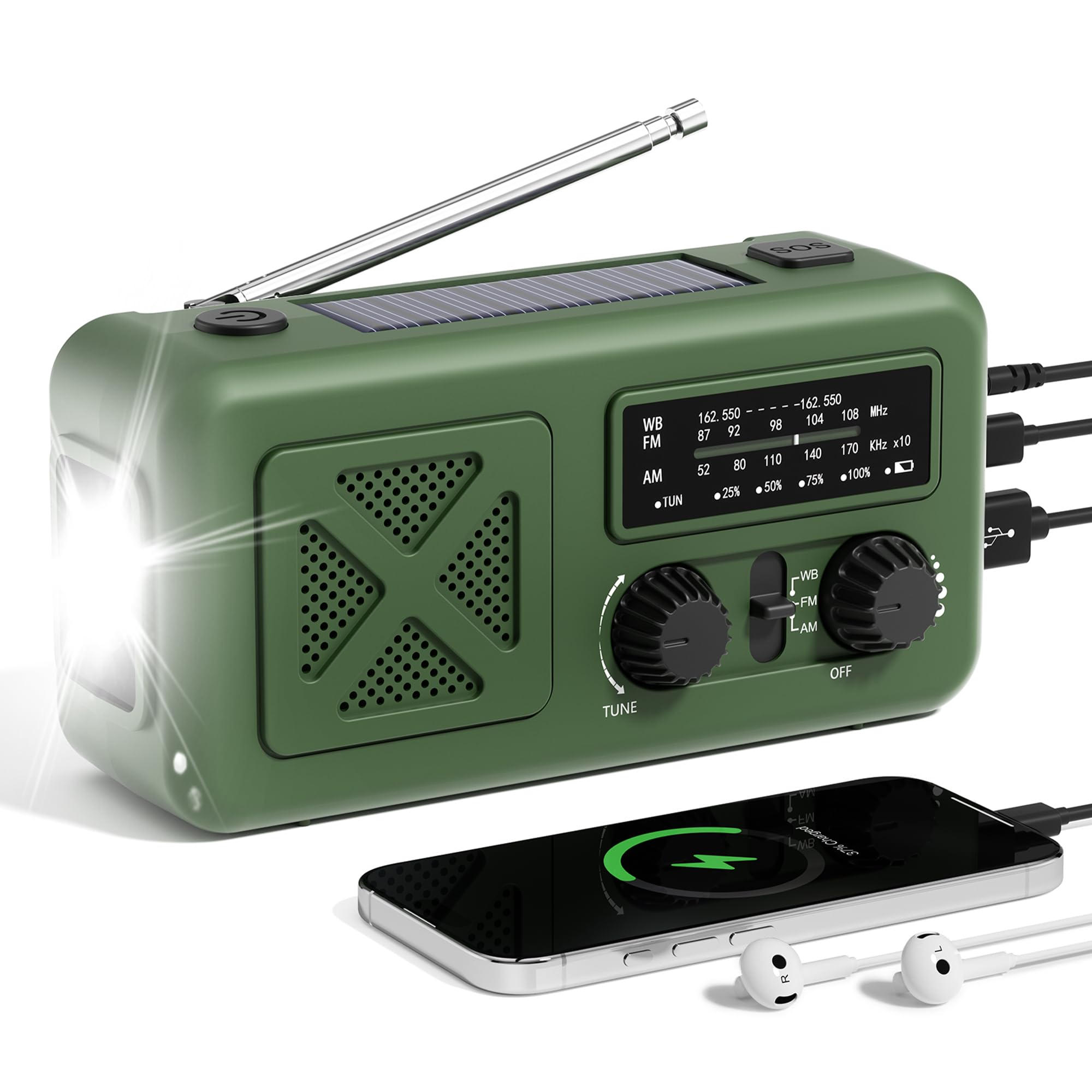 Radio de emergencia con manivela NOAA Radio meteorológica 7400 mWh, funciona con pilas, cable de carga 3 en 1, cargador de manivel