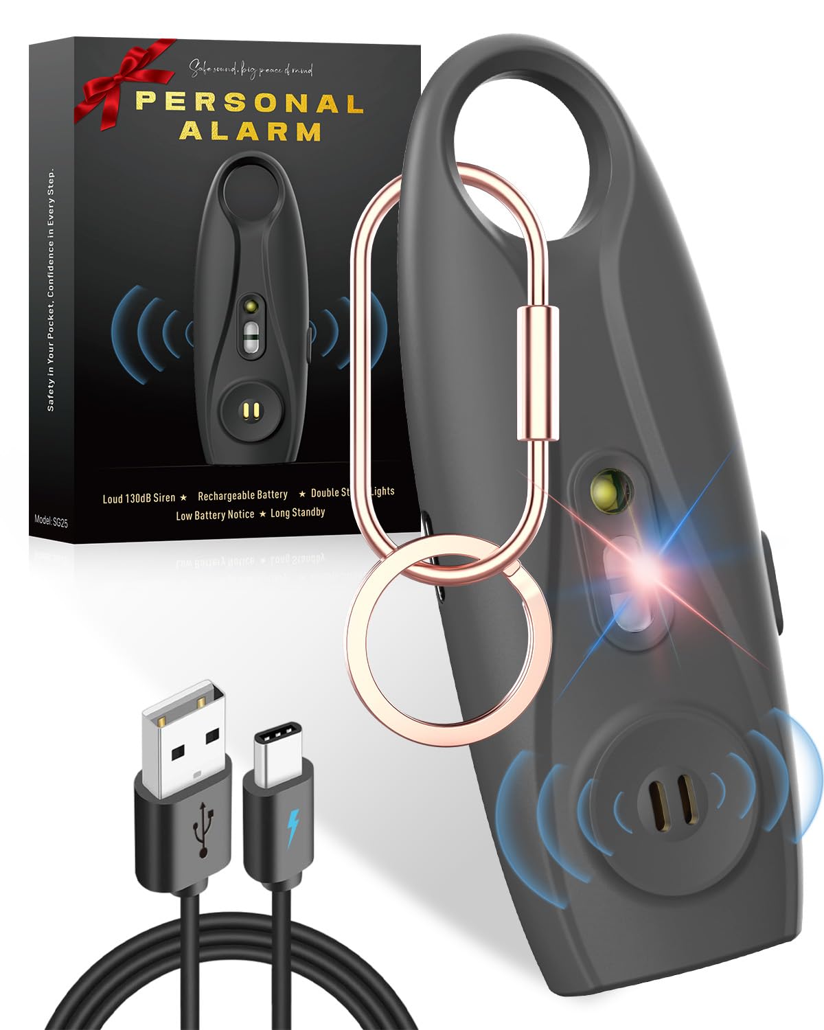 Alarma de seguridad personal, sirena fuerte recargable por USB de 130 dB con luces estroboscópicas dobles, linterna LED, aviso de