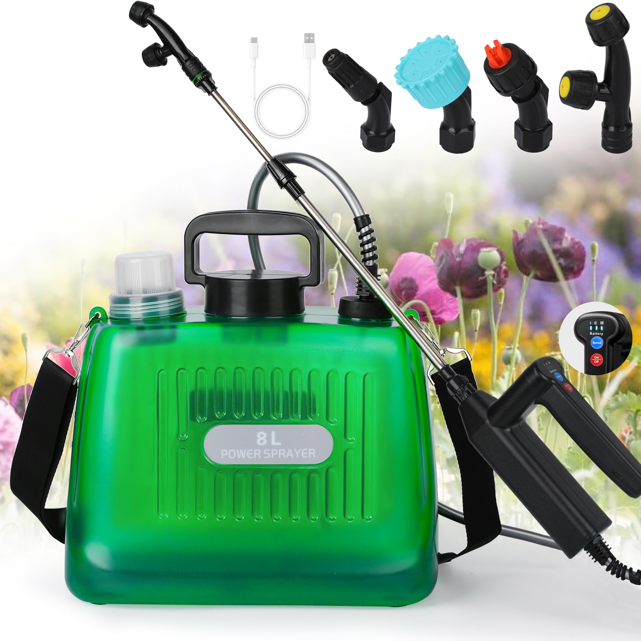Pulverizador a batería de 2 galones, pulverizador eléctrico con 4 boquillas de niebla, mango recargable por USB, varita telescópic