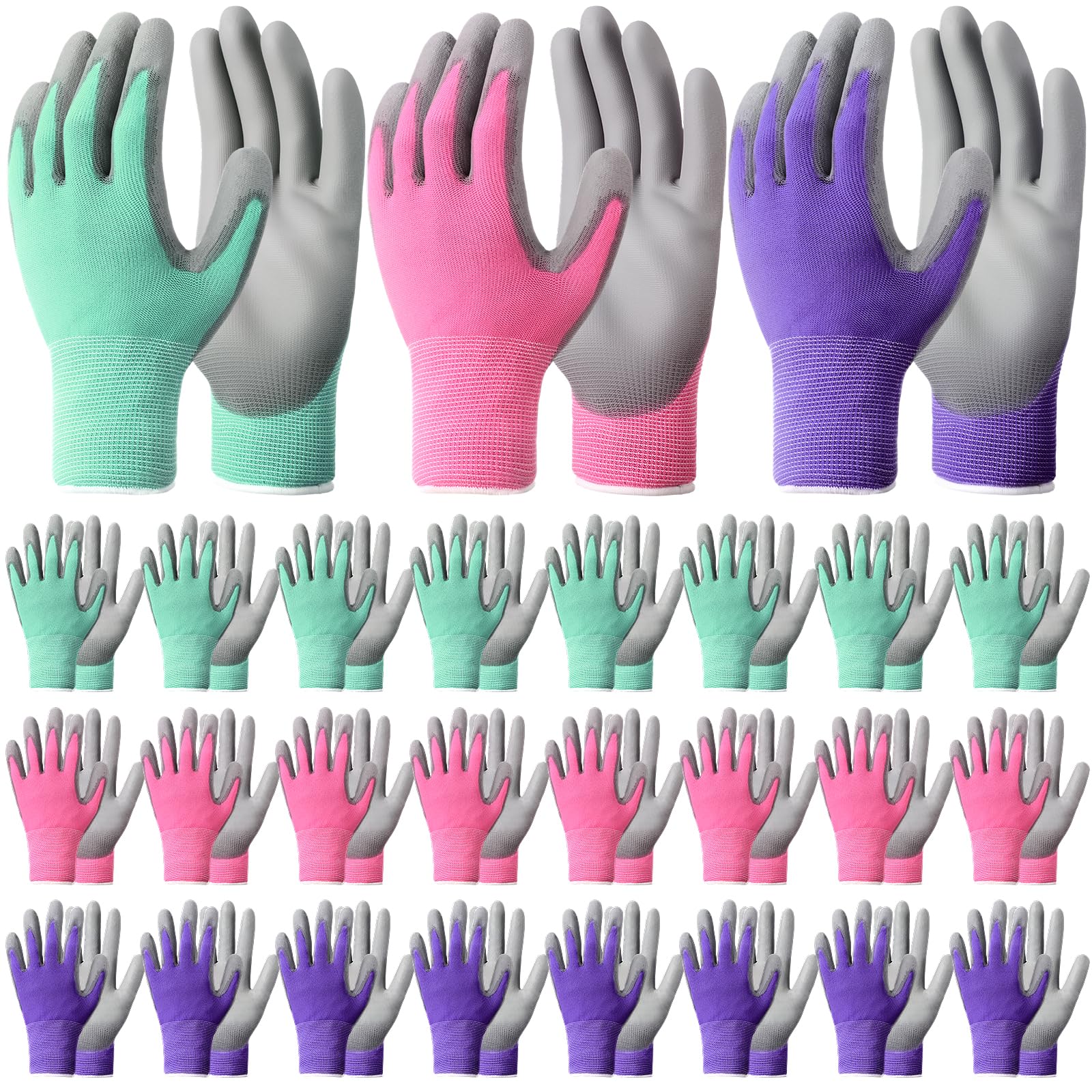 Maxdot Paquete de 24 guantes de jardinería para mujer, 3 colores, guantes de trabajo con revestimiento de poliuretano, guantes de
